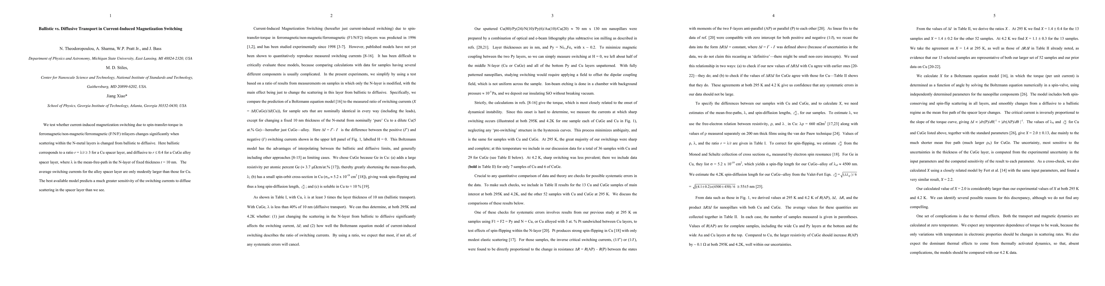 This study investigates the effect of scattering from ballistic to diffusive transport on current-induced magnetization switching in F/N/F trilayers. Contrary to model predictions, switching currents in CuGe alloy spacers are only modestly larger than those in Cu spacers, indicating less sensitivity to scattering type than expected.