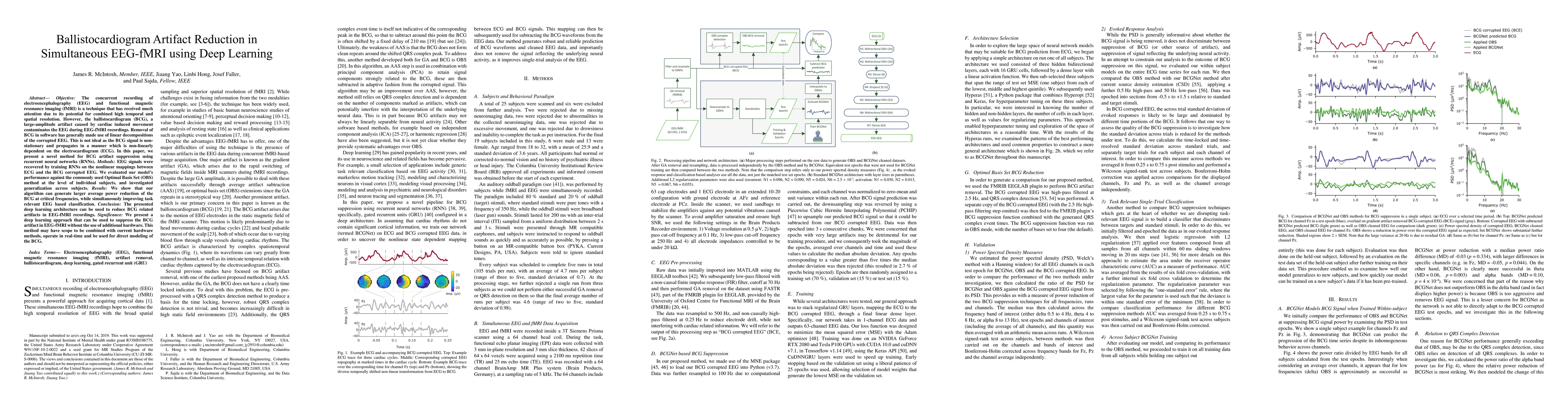 This paper proposes a novel deep learning approach using recurrent neural networks (RNNs) to reduce ballistocardiogram (BCG) artifacts in EEG-fMRI recordings, achieving better artifact suppression and improved EEG classification compared to traditional methods. The method shows potential for real-time application and integration with current hardware-based artifact reduction techniques.