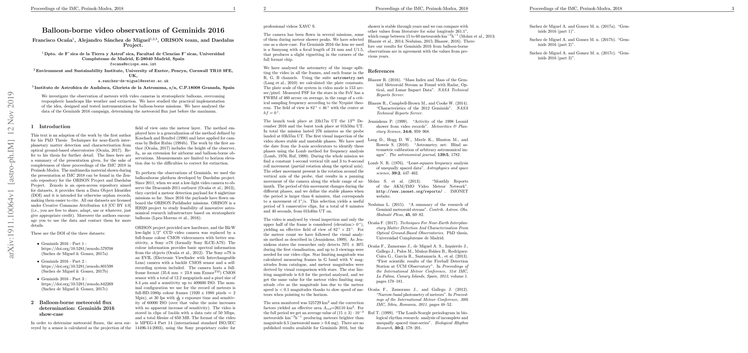 This research investigates using balloons to observe meteors, specifically during the Geminids 2016 event. It details the design and testing of equipment for such missions, and presents findings on meteoroid flux before the Geminids' peak.