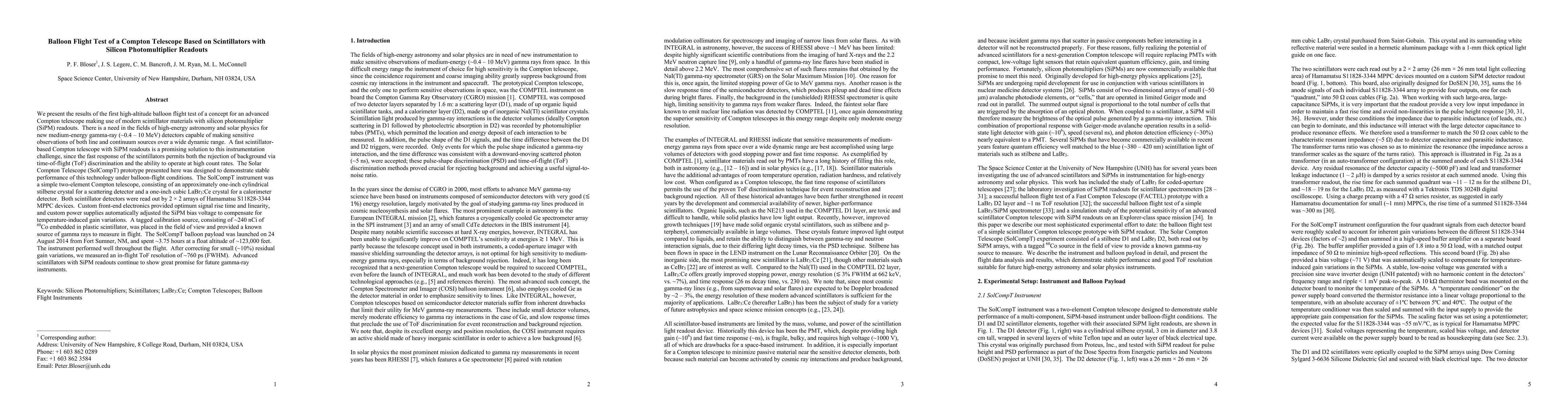 The first high-altitude balloon flight test of a Compton telescope using scintillators with silicon photomultiplier readouts demonstrated stable performance and a time-of-flight resolution of ~760 ps, indicating the potential for advanced medium-energy gamma-ray detectors.