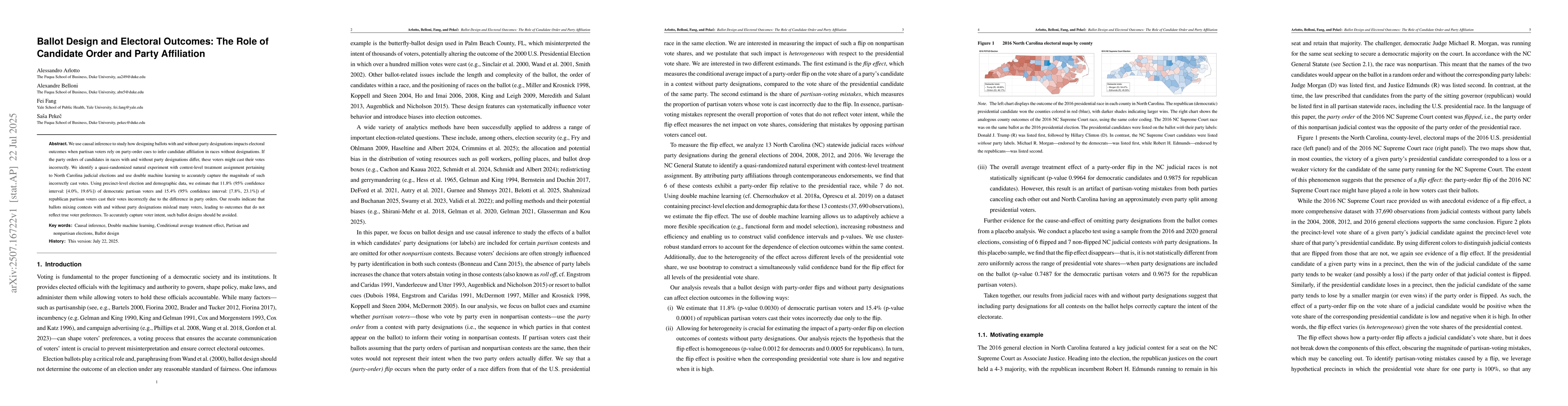This study uses causal inference to analyze the impact of ballot design, specifically the presence or absence of party designations, on electoral outcomes in North Carolina judicial elections. The researchers leverage a quasi-randomized natural experiment stemming from changes in the North Carolina General Statute affecting candidate arrangement on official ballots.