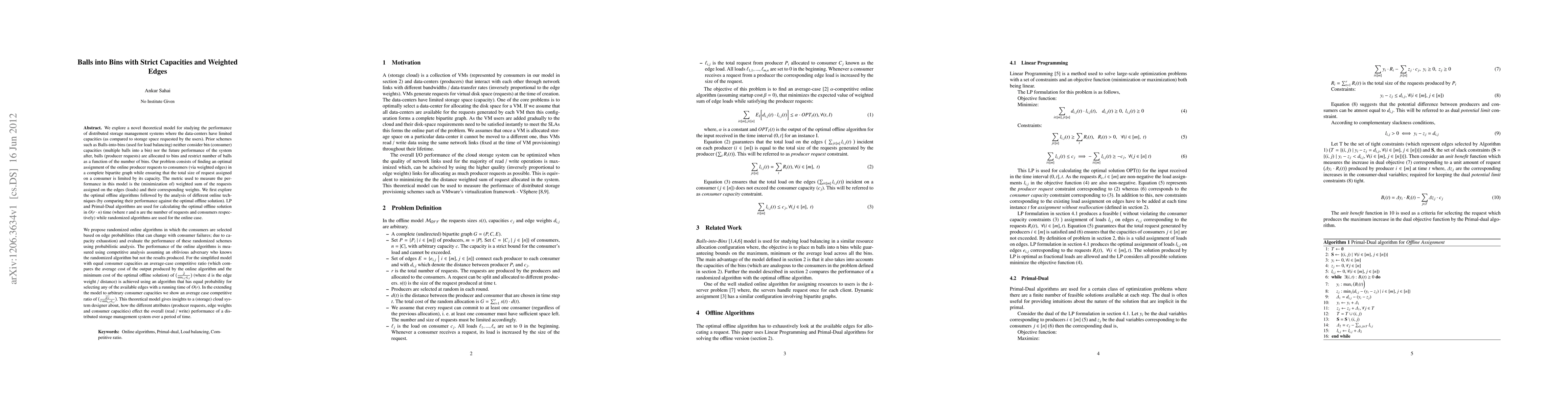 We explore a novel theoretical model for studying the performance of distributed storage management systems where the data-centers have limited capacities (as compared to storage space requested by the users). Prior schemes such as Balls-into-bins (used for load balancing) neither consider bin (consumer) capacities (multiple balls into a bin) nor the future performance of the system after, balls (producer requests) are allocated to bins and restrict number of balls as a function of the number of bins. Our problem consists of finding an optimal assignment of the online producer requests to consumers (via weighted edges) in a complete bipartite graph while ensuring that the total size of request assigned on a consumer is limited by its capacity. The metric used to measure the performance in this model is the (minimization of) weighted sum of the requests assigned on the edges (loads) and their corresponding weights. We first explore the optimal offline algorithms followed by competitive analysis of different online techniques. Using oblivious adversary. LP and Primal-Dual algorithms are used for calculating the optimal offline solution in O(r*n) time (where r and n are the number of requests and consumers respectively) while randomized algorithms are used for the online case. For the simplified model with equal consumer capacities an average-case competitive ratio of AVG(d) / MIN(d) (where d is the edge weight / distance) is achieved using an algorithm that has equal probability for selecting any of the available edges with a running time of $O(r)$. In the extending the model to arbitrary consumer capacities we show an average case competitive ratio of AVG(d*c) / (AVG(c) *MIN(d)).
