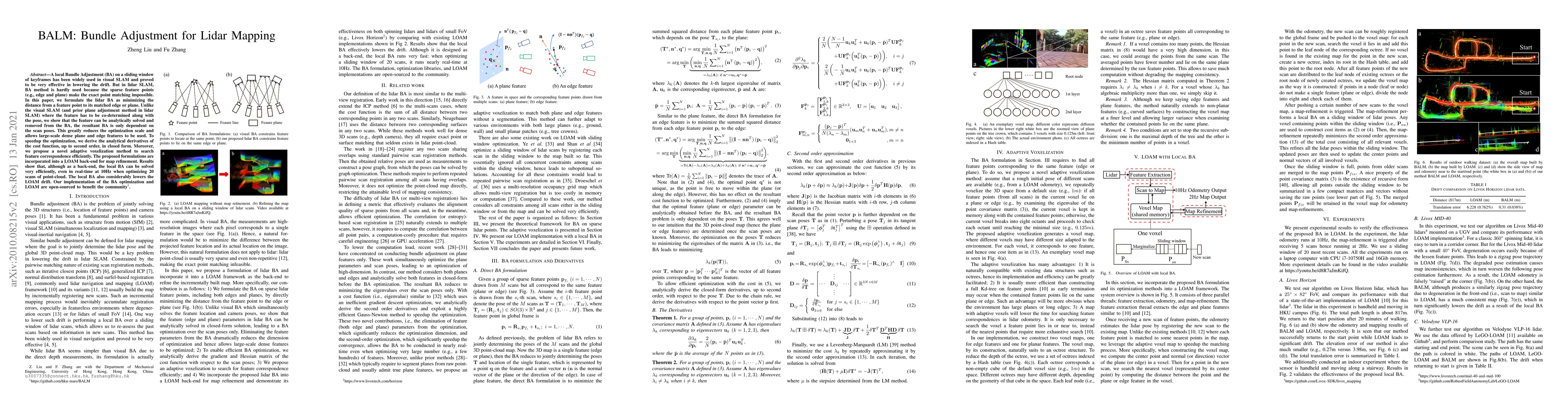 This paper introduces a Bundle Adjustment (BA) method for lidar mapping that minimizes the distance between lidar feature points and their corresponding edges or planes, allowing for efficient optimization and real-time map refinement. The method analytically solves features, reducing optimization scale and enabling the use of dense plane and edge features, while also incorporating an adaptive voxelization technique for efficient correspondence search.