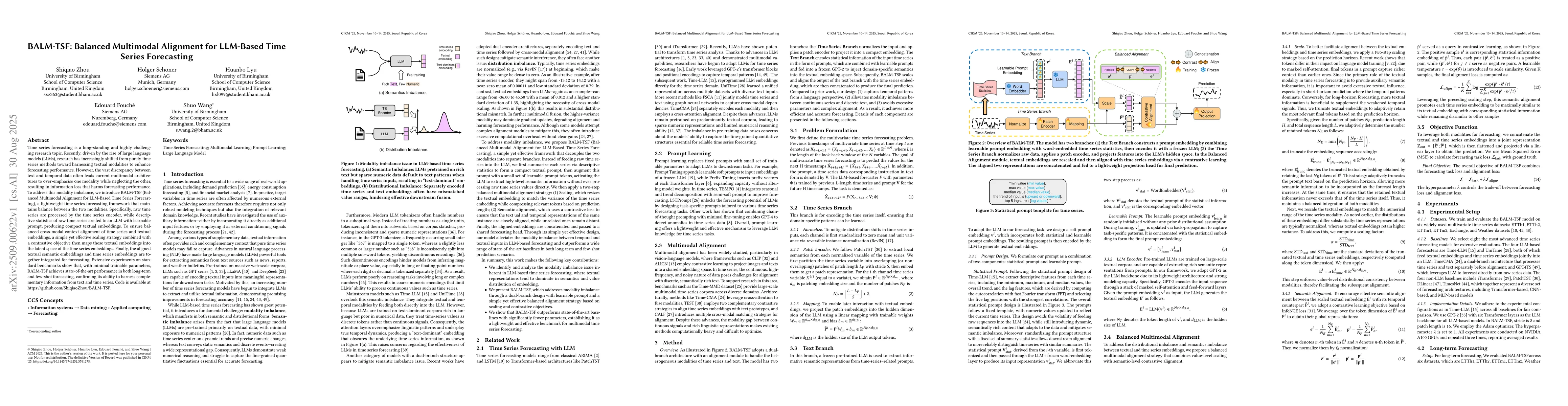Time series forecasting is a long-standing and highly challenging research topic. Recently, driven by the rise of large language models (LLMs), research has increasingly shifted from purely time series methods toward harnessing textual modalities to enhance forecasting performance. However, the vast discrepancy between text and temporal data often leads current multimodal architectures to over-emphasise one modality while neglecting the other, resulting in information loss that harms forecasting performance. To address this modality imbalance, we introduce BALM-TSF (Balanced Multimodal Alignment for LLM-Based Time Series Forecasting), a lightweight time series forecasting framework that maintains balance between the two modalities. Specifically, raw time series are processed by the time series encoder, while descriptive statistics of raw time series are fed to an LLM with learnable prompt, producing compact textual embeddings. To ensure balanced cross-modal context alignment of time series and textual embeddings, a simple yet effective scaling strategy combined with a contrastive objective then maps these textual embeddings into the latent space of the time series embeddings. Finally, the aligned textual semantic embeddings and time series embeddings are together integrated for forecasting. Extensive experiments on standard benchmarks show that, with minimal trainable parameters, BALM-TSF achieves state-of-the-art performance in both long-term and few-shot forecasting, confirming its ability to harness complementary information from text and time series. Code is available at https://github.com/ShiqiaoZhou/BALM-TSF.