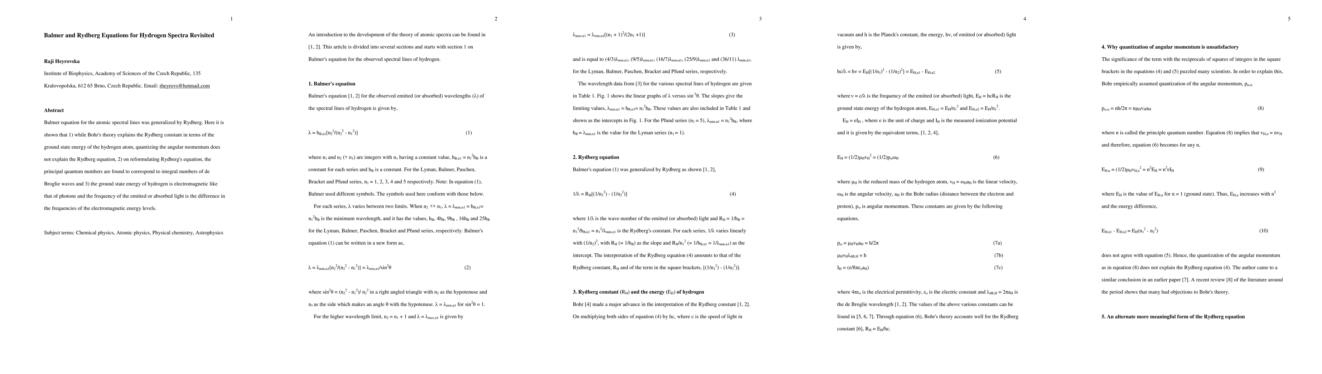 Balmer equation for the atomic spectral lines was generalized by Rydberg. Here it is shown that 1) while Bohr's theory explains the Rydberg constant in terms of the ground state energy of the hydrogen atom, quantizing the angular momentum does not explain the Rydberg equation, 2) on reformulating Rydberg's equation, the principal quantum numbers are found to correspond to integral numbers of de Broglie waves and 3) the ground state energy of hydrogen is electromagnetic like that of photons and the frequency of the emitted or absorbed light is the difference in the frequencies of the electromagnetic energy levels.