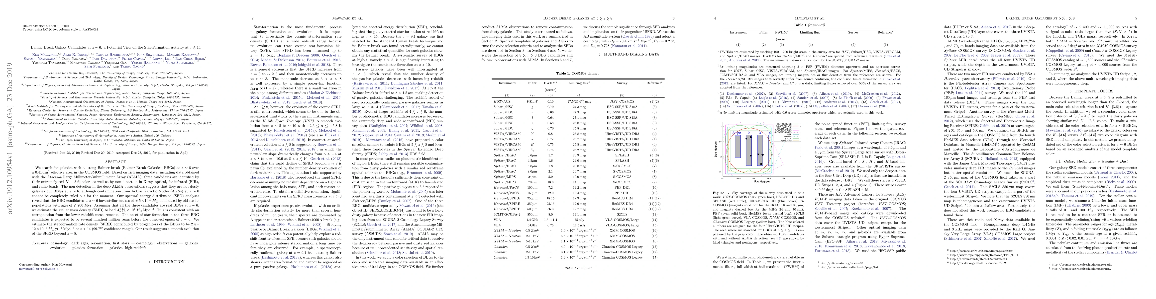 This study identifies three Balmer Break Galaxy candidates at $z \sim 6$ in the COSMOS field, suggesting they are old galaxies with minimal dust and star-formation activity. The findings imply a smooth star-formation rate density evolution beyond $z = 8$.