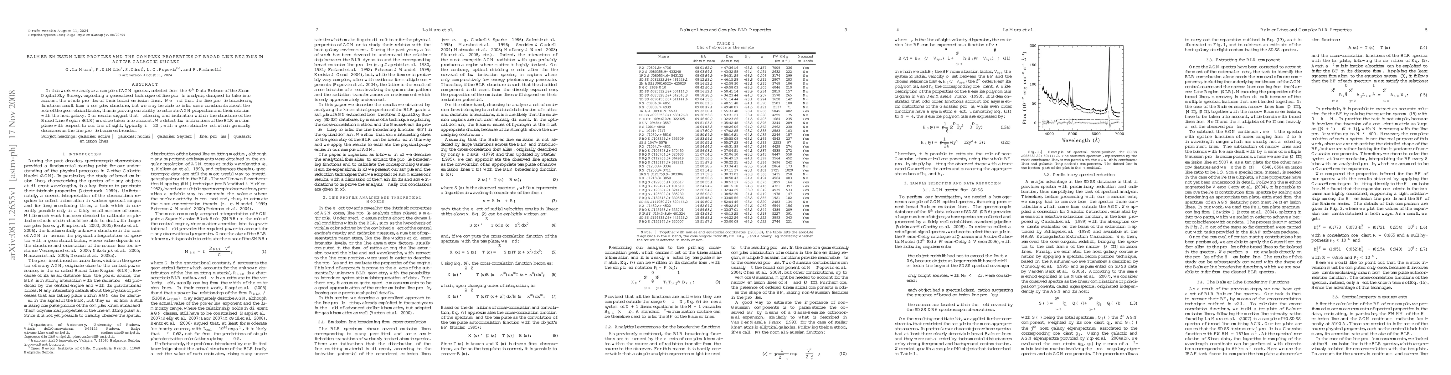 This study analyzes AGN spectra from the Sloan Digital Sky Survey using a generalized line profile analysis technique, revealing complex broadening functions in broad emission lines. The findings suggest that geometrical factors like flattening and inclination within the Broad Line Region must be considered, detecting low inclinations of the BLR motion plane and a geometrical effect that diminishes with broader line profiles.