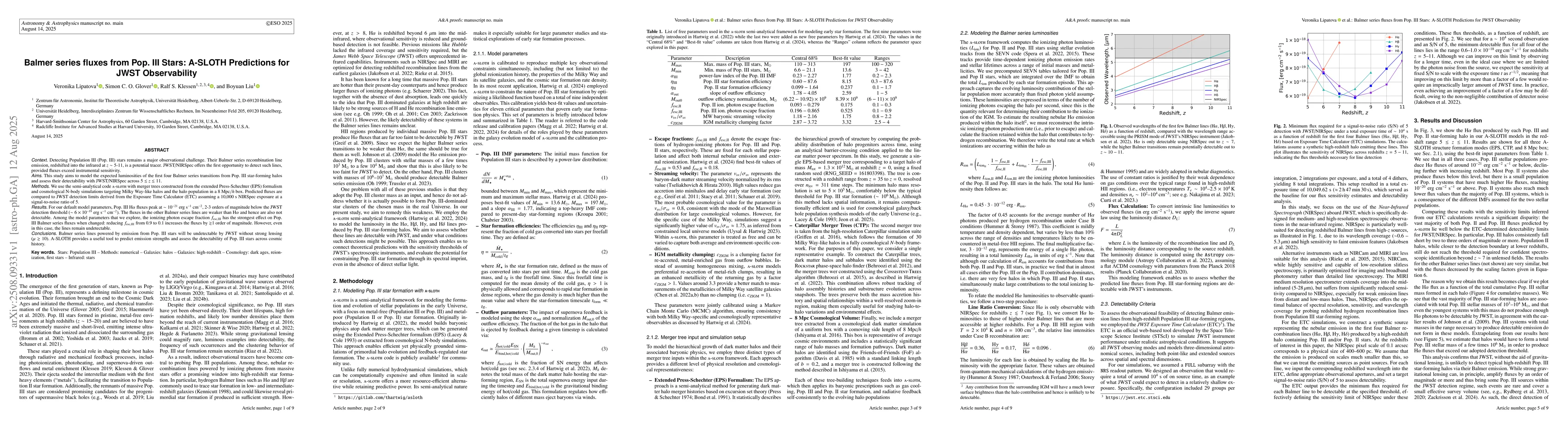 Detecting Population III (Pop. III) stars remains a major observational challenge. Their Balmer series recombination line emission, redshifted into the infrared at $z \sim 5-11$, is a potential tracer. JWST/NIRSpec offers the first opportunity to detect such lines, provided fluxes exceed instrumental sensitivity. This study aims to model the expected luminosities of the first four Balmer series transitions from Pop. III star-forming halos and assess their detectability with JWST/NIRSpec across $5 \leq z \leq 11$. We use the semi-analytical code A-SLOTH with merger trees constructed from the extended Press-Schechter (EPS) formalism and cosmological N-body simulations targeting Milky Way-like halos and the halo population in a 8~Mpc$/h$ box. Predicted fluxes are compared to JWST detection limits derived from the Exposure Time Calculator (ETC) assuming a 10,000 s NIRSpec exposure at a signal-to-noise ratio of 5. For our default model parameters, Pop. III H$\alpha$ fluxes peak at $\sim10^{-21}$ erg s$^{-1}$ cm$^{-2}$, 2-3 orders of magnitude below the JWST detection threshold ($\sim6 \times 10^{-19}$ erg s$^{-1}$ cm$^{-2}$). The fluxes in the other Balmer series lines are weaker than H$\alpha$ and hence are also not detectable. Among the model parameters that we explore, the ionizing photon escape fraction $f_{\mathrm{esc,III}}$ has the strongest effect on Pop. III Balmer series fluxes when changed: reducing $f_\mathrm{esc,III}$ from 0.9 to 0.1 increases the fluxes by $\gtrsim$1 order of magnitude. However, even in this case, the lines remain undetectable. Balmer series lines powered by emission from Pop. III stars will be undetectable by JWST without strong lensing ($\mu \gtrsim 10$). A-SLOTH provides a useful tool to predict emission strengths and assess the detectability of Pop. III stars across cosmic history.