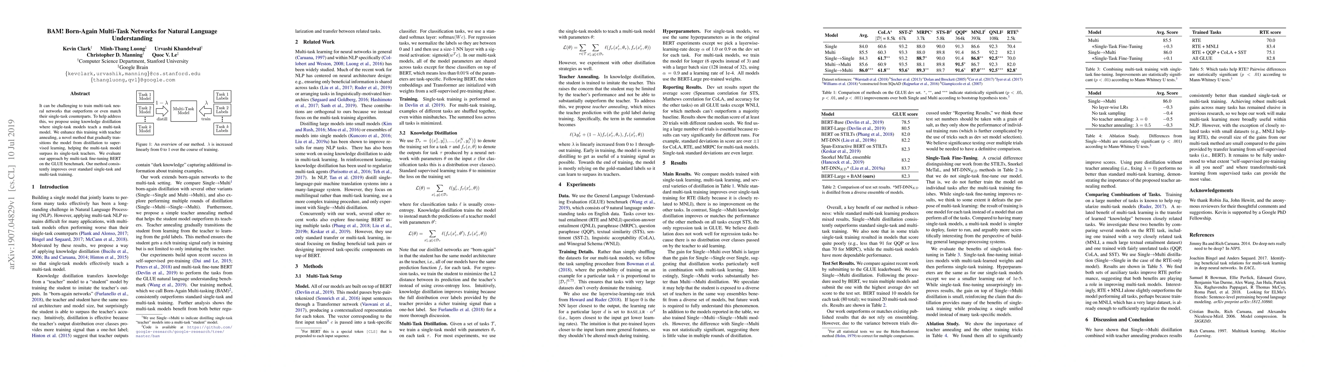 The paper proposes Born-Again Multi-Task Networks (BAM!) that leverage knowledge distillation and teacher annealing to enhance multi-task learning, achieving superior performance compared to single-task and standard multi-task training methods on the GLUE benchmark.