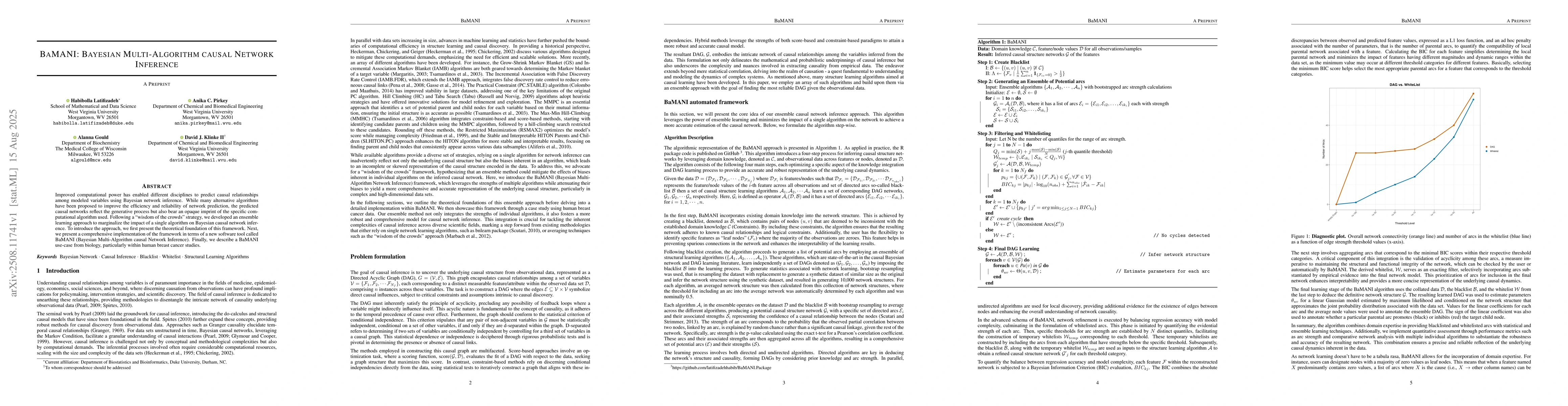 Improved computational power has enabled different disciplines to predict causal relationships among modeled variables using Bayesian network inference. While many alternative algorithms have been proposed to improve the efficiency and reliability of network prediction, the predicted causal networks reflect the generative process but also bear an opaque imprint of the specific computational algorithm used. Following a ``wisdom of the crowds" strategy, we developed an ensemble learning approach to marginalize the impact of a single algorithm on Bayesian causal network inference. To introduce the approach, we first present the theoretical foundation of this framework. Next, we present a comprehensive implementation of the framework in terms of a new software tool called BaMANI (Bayesian Multi-Algorithm causal Network Inference). Finally, we describe a BaMANI use-case from biology, particularly within human breast cancer studies.