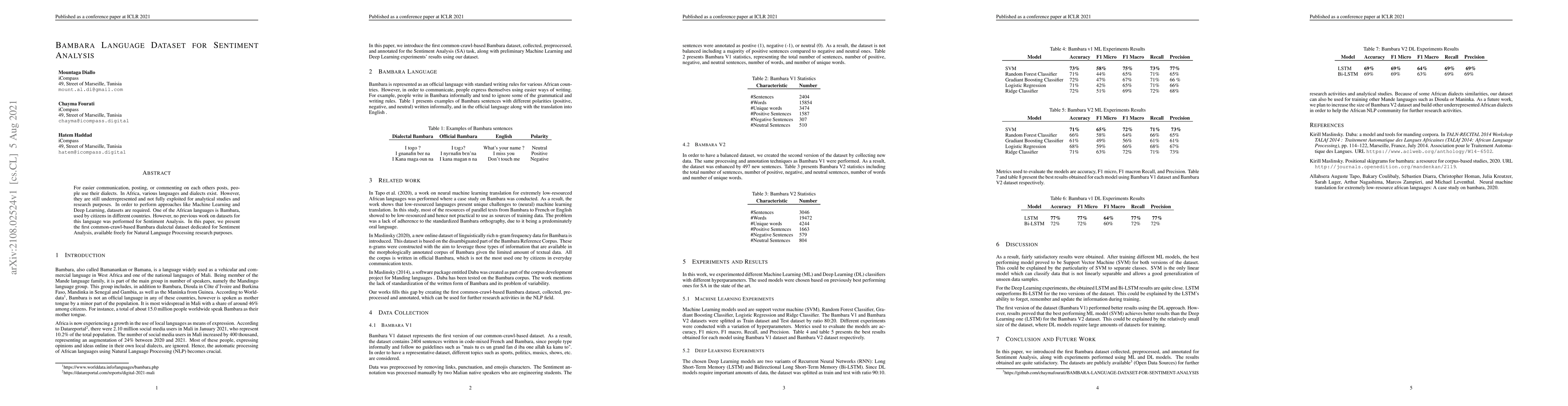 This paper introduces the first Bambara dialectal dataset for Sentiment Analysis, created from common crawl data, to support Natural Language Processing research and address the underrepresentation of African languages in analytical studies. The dataset is freely available for researchers.
