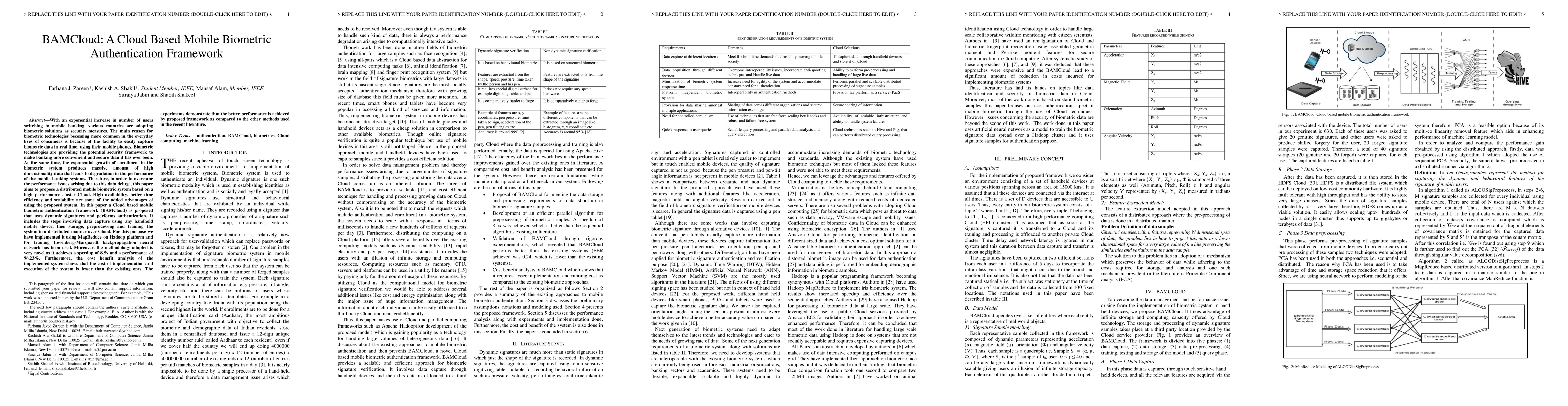 BAMCloud proposes a cloud-based mobile biometric authentication framework to enhance security and efficiency in mobile banking by leveraging distributed cloud computing. The system achieves high availability, scalability, and a performance improvement of 96.23% using dynamic signatures and neural network training on the Hadoop platform.