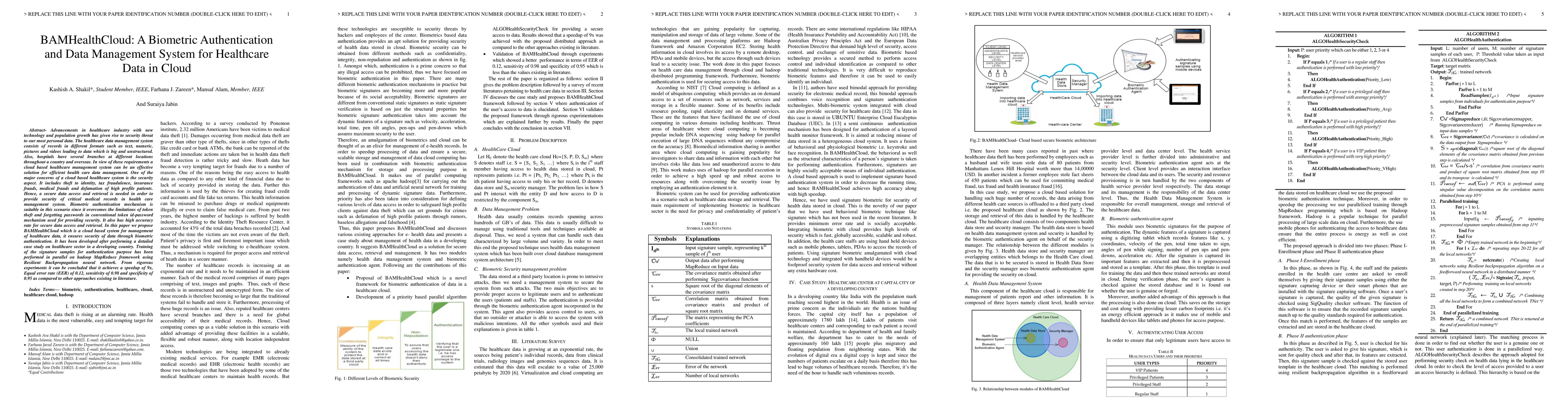 BAMHealthCloud is a cloud-based biometric authentication and healthcare data management system designed to secure sensitive medical records. It employs a Resilient Backpropagation neural network on Hadoop MapReduce for efficient training and achieves notable performance metrics, including a speedup of 9x, EER of 0.12, and high sensitivity and specificity.