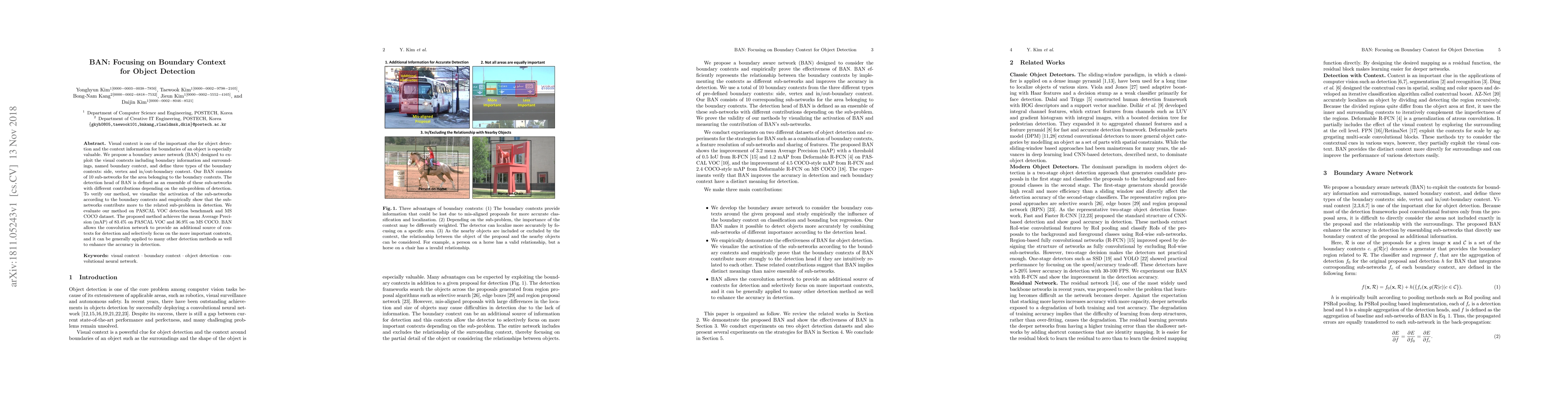 The BAN (Boundary Aware Network) improves object detection accuracy by focusing on boundary context and surroundings, achieving 83.4% mAP on PASCAL VOC and 36.9% mAP on MS COCO.
