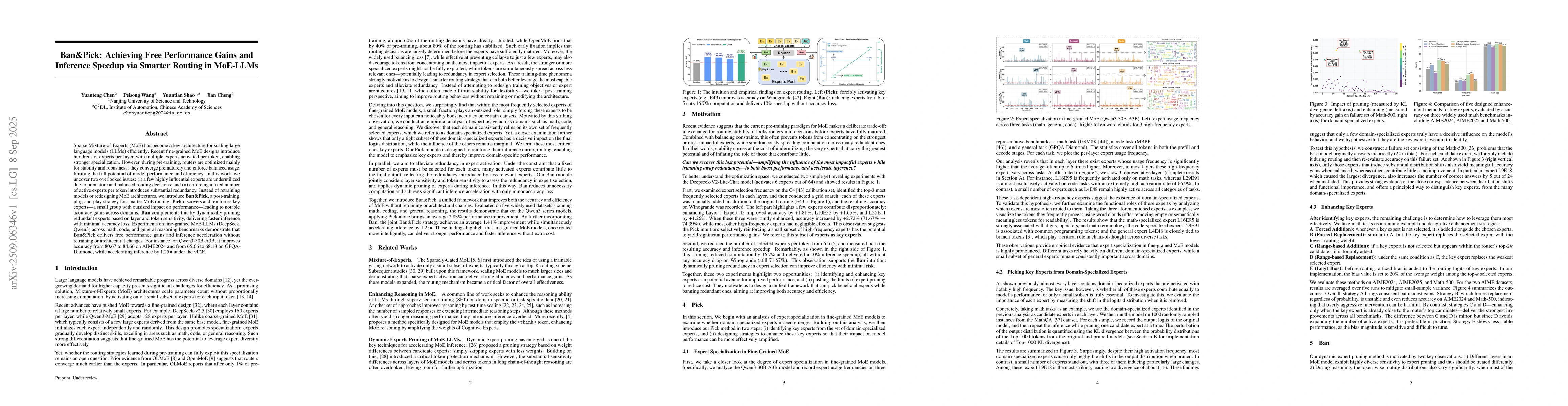 Sparse Mixture-of-Experts (MoE) has become a key architecture for scaling large language models (LLMs) efficiently. Recent fine-grained MoE designs introduce hundreds of experts per layer, with multiple experts activated per token, enabling stronger specialization. However, during pre-training, routers are optimized mainly for stability and robustness: they converge prematurely and enforce balanced usage, limiting the full potential of model performance and efficiency. In this work, we uncover two overlooked issues: (i) a few highly influential experts are underutilized due to premature and balanced routing decisions; and (ii) enforcing a fixed number of active experts per token introduces substantial redundancy. Instead of retraining models or redesigning MoE architectures, we introduce Ban&Pick, a post-training, plug-and-play strategy for smarter MoE routing. Pick discovers and reinforces key experts-a small group with outsized impact on performance-leading to notable accuracy gains across domains. Ban complements this by dynamically pruning redundant experts based on layer and token sensitivity, delivering faster inference with minimal accuracy loss. Experiments on fine-grained MoE-LLMs (DeepSeek, Qwen3) across math, code, and general reasoning benchmarks demonstrate that Ban&Pick delivers free performance gains and inference acceleration without retraining or architectural changes. For instance, on Qwen3-30B-A3B, it improves accuracy from 80.67 to 84.66 on AIME2024 and from 65.66 to 68.18 on GPQA-Diamond, while accelerating inference by 1.25x under the vLLM.