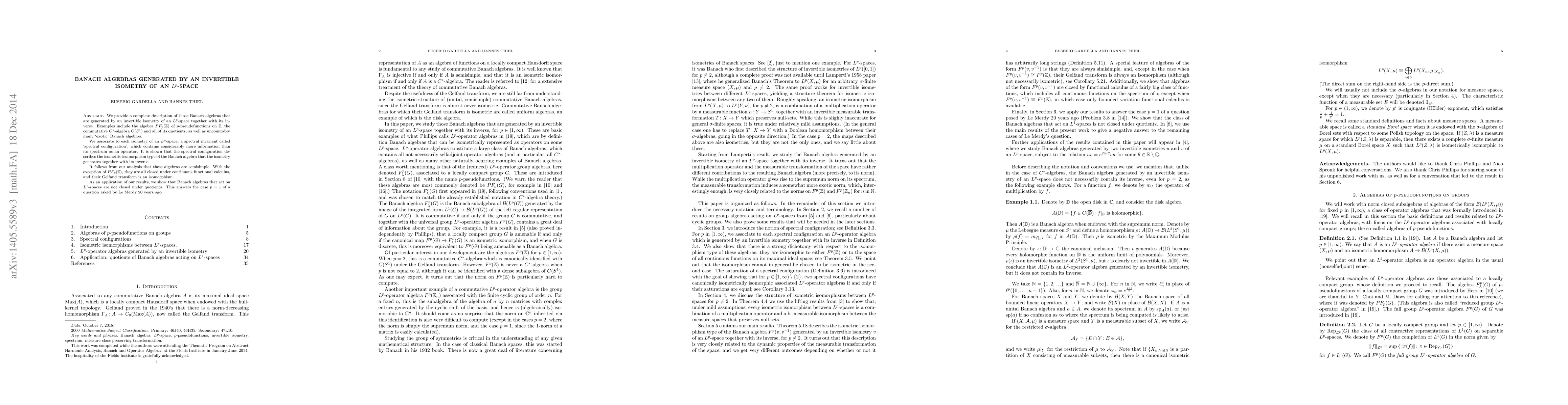 We provide a complete description of those Banach algebras that are generated by an invertible isometry of an $L^p$-space together with its inverse. Examples include the algebra $PF_p(\mathbb{Z})$ of $p$-pseudofunctions on $\mathbb{Z}$, the commutative $C^*$-algebra $C(S^1)$ and all of its quotients, as well as uncountably many `exotic' Banach algebras. We associate to each isometry of an $L^p$-space, a spectral invariant called `spectral configuration', which contains considerably more information than its spectrum as an operator. It is shown that the spectral configuration describes the isometric isomorphism type of the Banach algebra that the isometry generates together with its inverse. It follows from our analysis that these algebras are semisimple. With the exception of $PF_p(\mathbb{Z})$, they are all closed under continuous functional calculus, and their Gelfand transform is an isomorphism. As an application of our results, we show that Banach algebras that act on $L^1$-spaces are not closed under quotients. This answers the case $p=1$ of a question asked by Le Merdy 20 years ago.