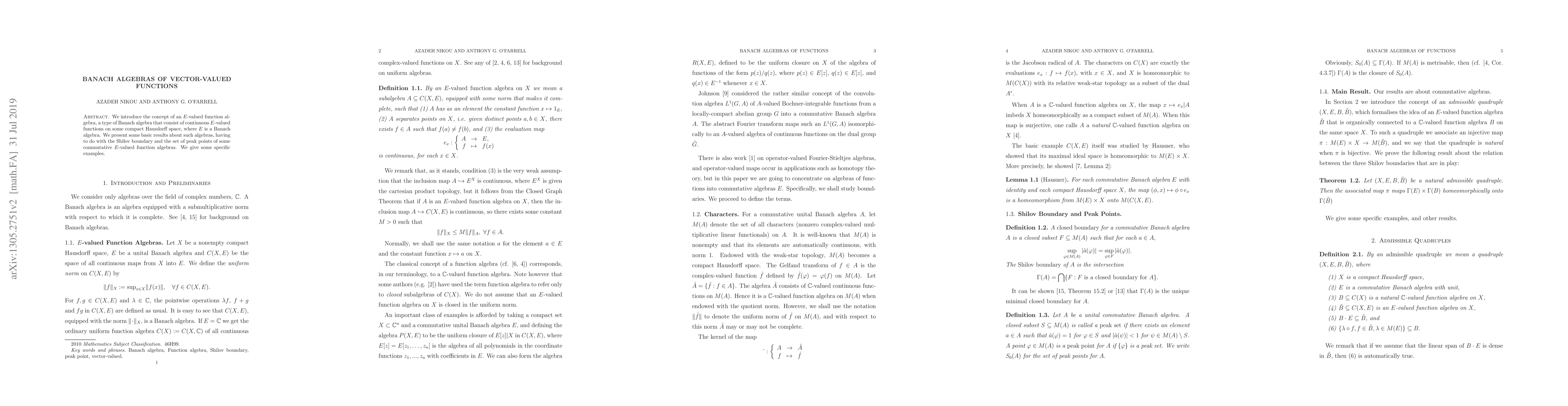 This paper introduces $E$-valued function algebras, a type of Banach algebra consisting of continuous $E$-valued functions on compact Hausdorff spaces, where $E$ is a Banach algebra. It explores basic results related to the Shilov boundary and peak points of these algebras, along with specific examples.