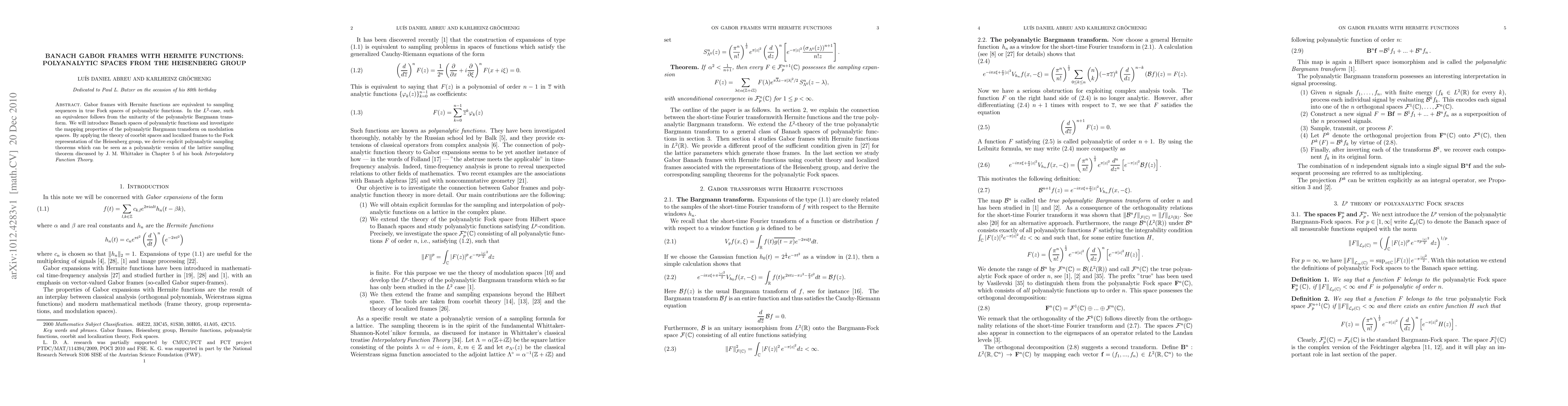 This paper explores Banach Gabor frames using Hermite functions and establishes their equivalence to sampling sequences in true Fock spaces of polyanalytic functions. It introduces Banach spaces of polyanalytic functions and derives polyanalytic sampling theorems by applying coorbit spaces and localized frames to the Fock representation of the Heisenberg group.