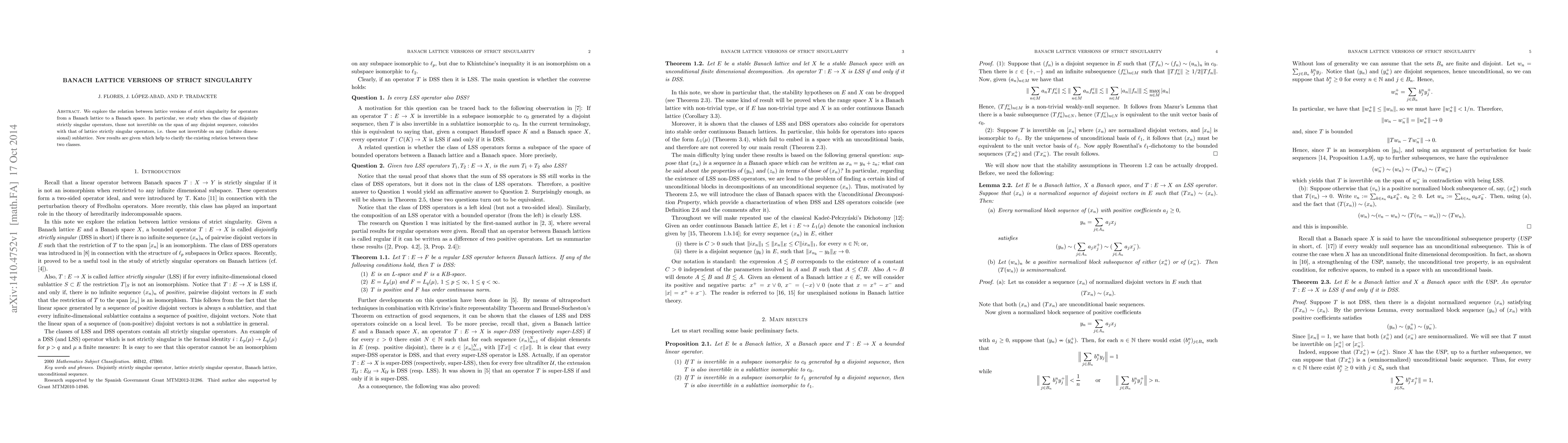 We explore the relation between lattice versions of strict singularity for operators from a Banach lattice to a Banach space. In particular, we study when the class of disjointly strictly singular operators, those not invertible on the span of any disjoint sequence, coincides with that of lattice strictly singular operators, i.e. those not invertible on any (infinite dimensional) sublattice. New results are given which help to clarify the existing relation between these two classes.