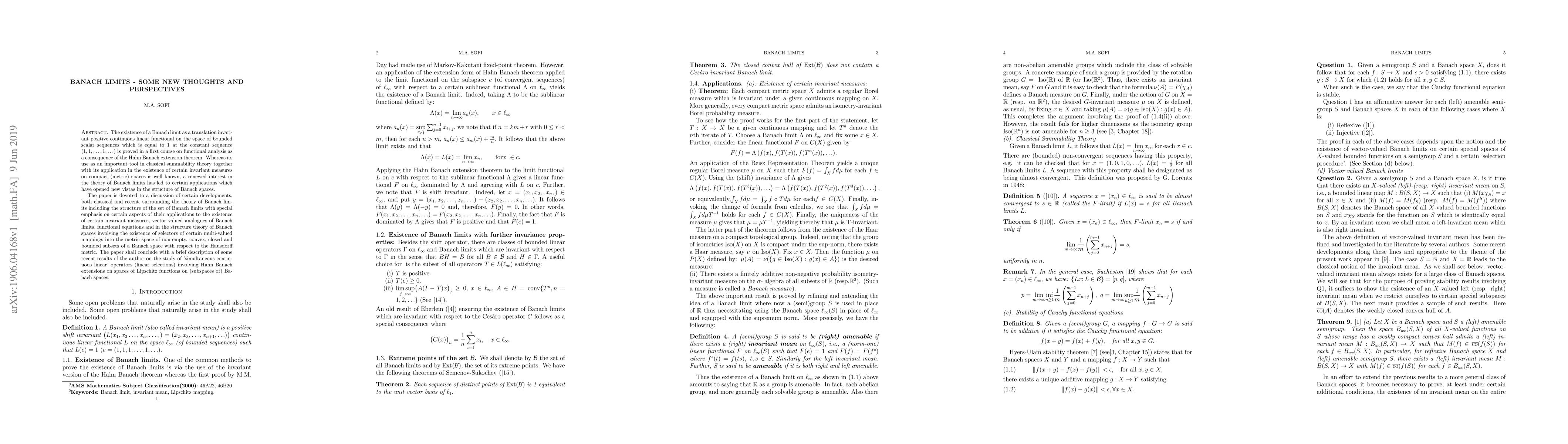 This paper explores recent advancements in the theory of Banach limits, focusing on their structure, applications in summability theory, and their role in invariant measure existence. It also discusses vector-valued analogues, functional equations, and their implications for the structure theory of Banach spaces, including the existence of selectors for multi-valued mappings.