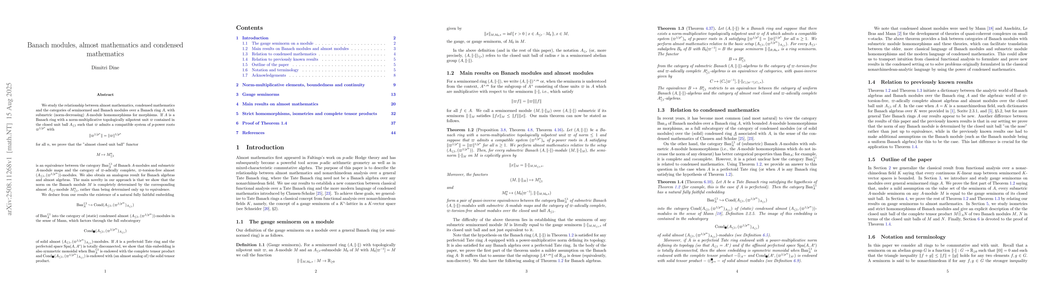 We study the relationship between almost mathematics, condensed mathematics and the categories of seminormed and Banach modules over a Banach ring $A$, with submetric (norm-decreasing) $A$-module homomorphisms for morphisms. If $A$ is a Banach ring with a norm-multiplicative topologically nilpotent unit $\varpi$ contained in the closed unit ball $A_{\leq1}$ such that $\varpi$ admits a compatible system of $p$-power roots $\varpi^{1/p^{n}}$ with \begin{equation*}\lVert\varpi^{1/p^{n}}\rVert=\lVert\varpi\rVert^{1/p^{n}}\end{equation*}for all $n$, we prove that the "almost closed unit ball" functor \begin{equation*}M\mapsto M_{\leq1}^{a}\end{equation*}is an equivalence between the category of Banach $A$-modules and submetric $A$-module maps and the category of $\varpi$-adically complete, $\varpi$-torsion-free almost $(A_{\leq1}, (\varpi^{1/p^{\infty}}))$-modules. We also obtain an analogous result for Banach algebras and almost algebras. The main novelty in our approach is that we show that the norm on the Banach module $M$ is completely determined by the corresponding almost $A_{\leq1}$-module $M_{\leq1}^{a}$, rather than being determined only up to equivalence. We deduce from our results the existence of a natural fully faithful embedding of the category of Banach $A$-modules and submetric $A$-module maps into the category of (static) condensed almost $(A_{\leq1}, (\varpi^{1/p^{\infty}}))$-modules in the sense of Mann, which factors through the full subcategory of solid condensed $(A_{\leq1}, (\varpi^{1/p^{\infty}}))$-almost modules. If $A$ is perfectoid and the adic spectrum of $(A, A^{\circ})$ is totally disconnected, we show that this embedding transforms the complete tensor product of Banach $A$-modules into (an almost analog of) the solid tensor product of solid condensed almost modules.