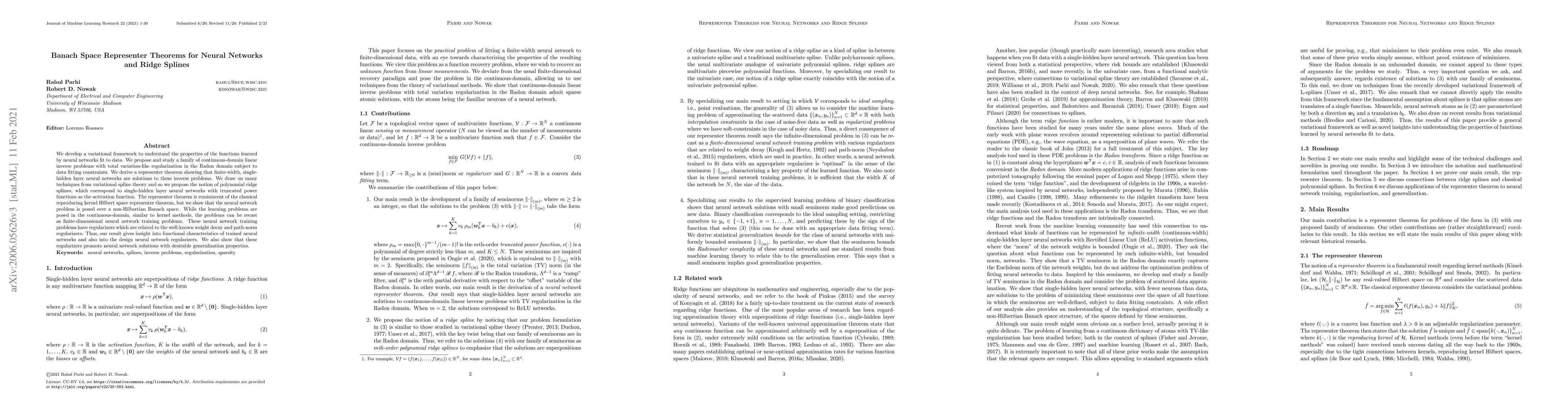 This paper develops a variational framework to analyze neural networks, deriving a representer theorem that shows finite-width, single-hidden layer neural networks solve continuous-domain inverse problems with total variation regularization. It also introduces polynomial ridge splines as a neural network analog, providing insights into functional characteristics and regularization design.