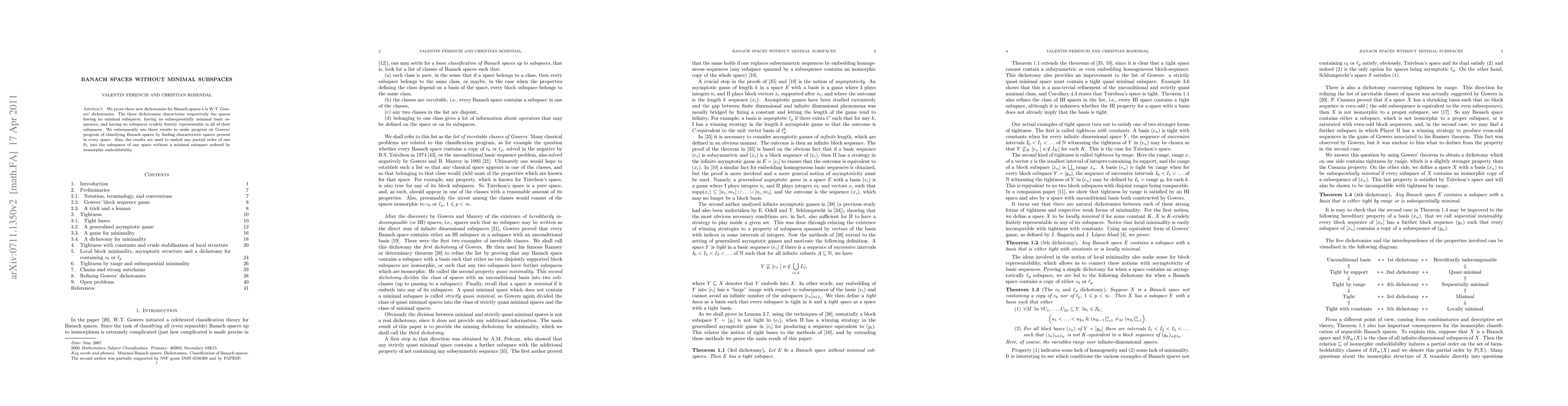 This paper establishes three new dichotomies for Banach spaces, characterizing those without minimal subspaces, subsequentially minimal basic sequences, and subspaces crudely finitely representable in all their subspaces. It also advances Gowers' program to classify Banach spaces and embeds any partial order of size $\aleph_1$ into the subspaces of any space without a minimal subspace.