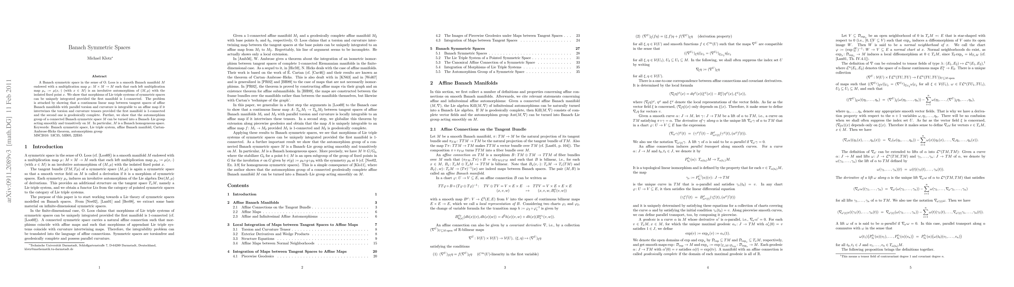 This paper explores Banach symmetric spaces, demonstrating that morphisms of Lie triple systems can be uniquely integrated under certain conditions. It also shows that the automorphism group of such spaces can be structured as a Banach-Lie group, establishing the space as a Banach homogeneous space.