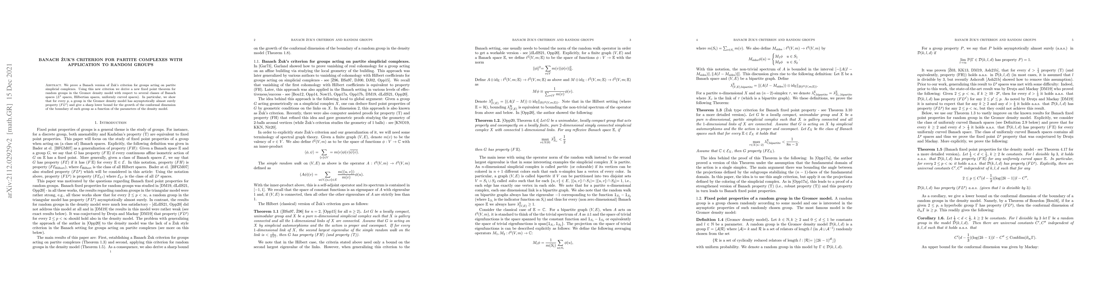 We prove a Banach version of \.Zuk's criterion for groups acting on partite simplicial complexes. Using this new criterion we derive a new fixed point theorem for random groups in the Gromov density model with respect to several classes of Banach spaces ($L^p$ spaces, Hilbertian spaces, uniformly curved spaces). In particular, we show that for every $p$, a group in the Gromov density model has asymptotically almost surely property $(F L^p)$ and give a sharp lower bound for the growth of the conformal dimension of the boundary of such group as a function of the parameters of the density model.