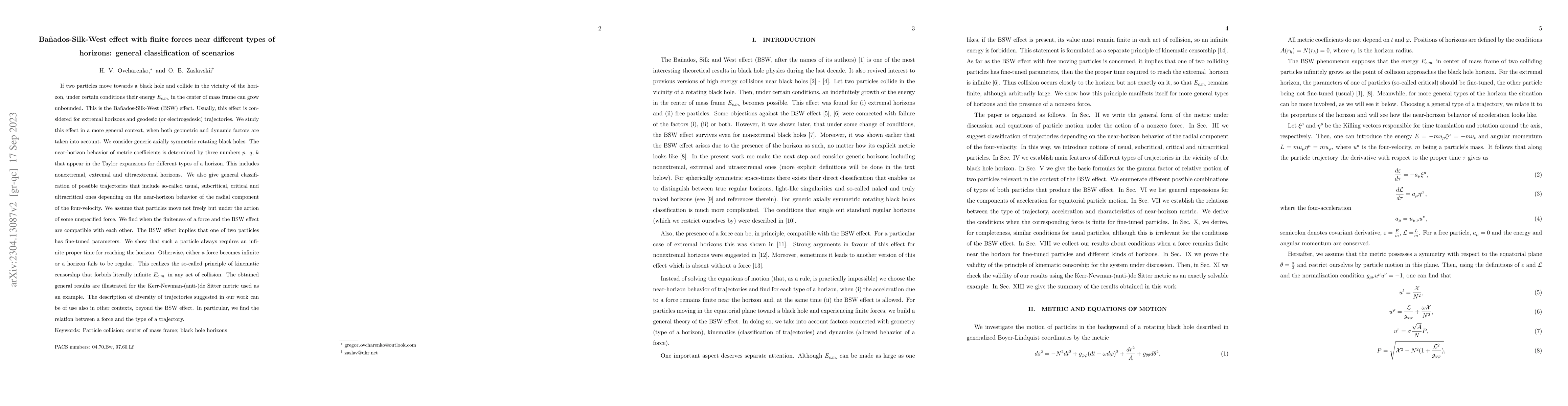 If two particles move towards a black hole and collide in the vicinity of the horizon, under certain conditions their energy $E_{c.m.}$ in the center of mass frame can grow unbounded. This is the Ba\~{n}ados-Silk-West (BSW) effect. Usually, this effect is considered for extremal horizons and geodesic (or electrogedesic) trajectories. We study this effect in a more general context, when both geometric and dynamic factors are taken into account. We consider generic axially symmetric rotating black holes. The near-horizon behavior of metric coefficients is determined by three numbers $p,~q,$ $k$ that appear in the Taylor expansions for different types of a horizon$.$ This includes nonextremal, extremal and ultraextremal horizons. We also give general classification of possible trajectories that include so-called usual, subcritical, critical and ultracritical ones depending on the near-horizon behavior of the radial component of the four-velocity. We assume that particles move not freely but under the action of some unspecified force. We find when the finiteness of a force and the BSW effect are compatible with each other. The BSW effect implies that one of two particles has fine-tuned parameters. We show that such a particle always requires an infinite proper time for reaching the horizon. Otherwise, either a force becomes infinite or a horizon fails to be regular. This realizes the so-called principle of kinematic censorship that forbids literally infinite $E_{c.m.}$ in any act of collision. The obtained general results are illustrated for the Kerr-Newman-(anti-)de Sitter metric used as an example. The description of diversity of trajectories suggested in our work can be of use also in other contexts, beyond the BSW effect. In particular, we find the relation between a force and the type of a trajectory.