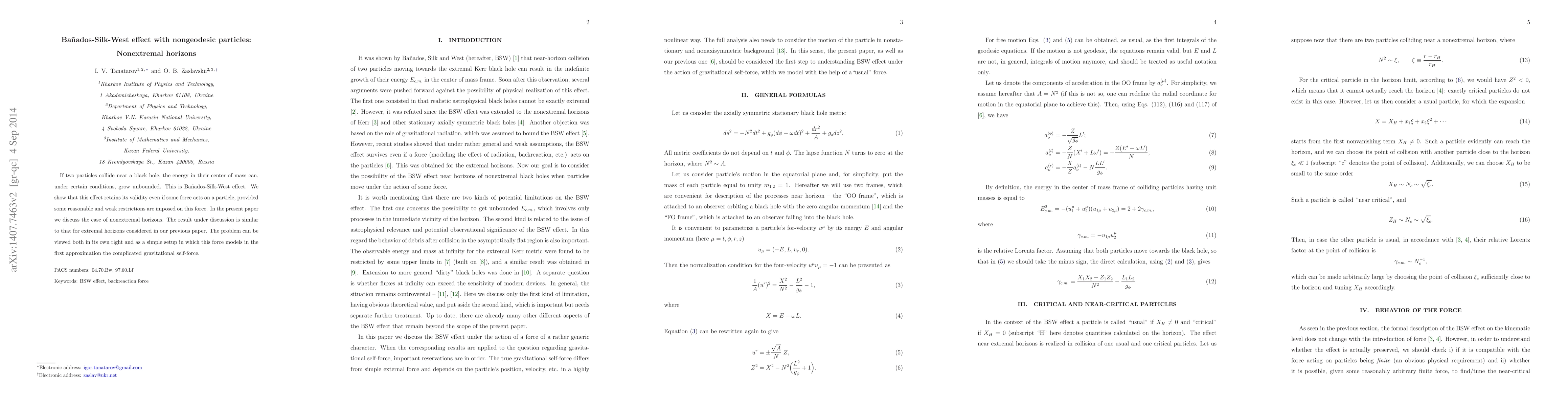 When two particles collide near a black hole, the energy in their center of mass frame can, under certain conditions, grow unbounded. This is the Banados-Silk-West effect. We show that this effect retains its validity even if some force acts on a particle, provided some reasonable and weak restrictions are imposed on this force. In the present work we discuss the case of nonextremal horizons. The result under discussion is similar to that for extremal horizons considered in our previous work.