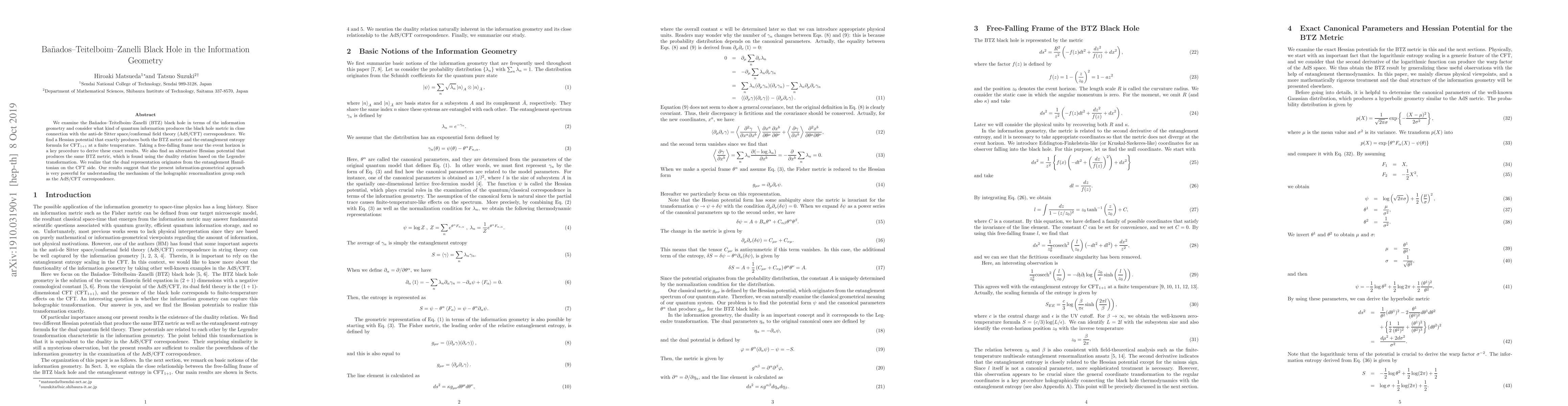 We examine the Banados-Teitelboim-Zanelli (BTZ) black hole in terms of the information geometry and consider what kind of quantum information produces the black hole metric in close connection with the anti-de Sitter space/conformal field theory (AdS/CFT) correspondence. We find a Hessian potential that exactly produces both the BTZ metric and the entanglement entropy formula for CFT_{1+1} at a finite temperature. Taking a free-falling frame near the event horizon is a key procedure to derive these exact results. We also find an alternative Hessian potential that produces the same BTZ metric, which is found using the duality relation based on the Legendre transformation. We realize that the dual representation originates from the entanglement Hamiltonian on the CFT side. Our results suggest that the present information-geometrical approach is very powerful for understanding the mechanism of the holographic renormalization group such as the AdS/CFT correspondence.