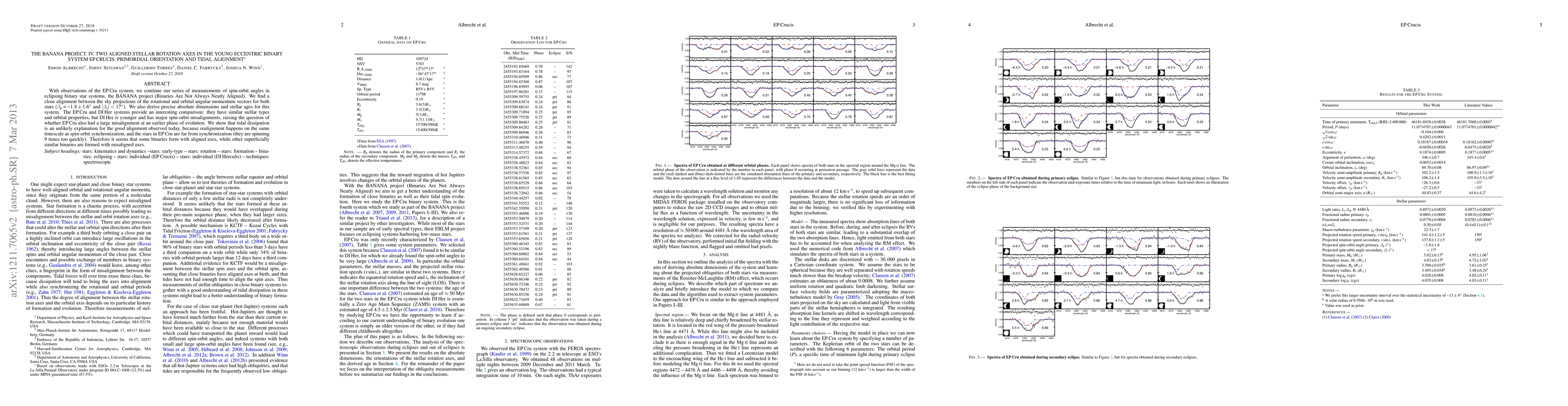 With observations of the EP Cru system, we continue our series of measurements of spin-orbit angles in eclipsing binary star systems, the BANANA project (Binaries Are Not Always Neatly Aligned). We find a close alignment between the sky projections of the rotational and orbital angular momentum vectors for both stars (beta_p = -1.8+-1.6 deg and |beta_s|<17 deg). We also derive precise absolute dimensions and stellar ages for this system. The EP Cru and DI Her systems provide an interesting comparison: they have similar stellar types and orbital properties, but DI Her is younger and has major spin-orbit misalignments, raising the question of whether EP Cru also had a large misalignment at an earlier phase of evolution. We show that tidal dissipation is an unlikely explanation for the good alignment observed today, because realignment happens on the same timescale as spin-orbit synchronization, and the stars in EP Cru are far from syncrhonization (they are spinning 9 times too quickly). Therefore it seems that some binaries form with aligned axes, while other superficially similar binaries are formed with misaligned axes.