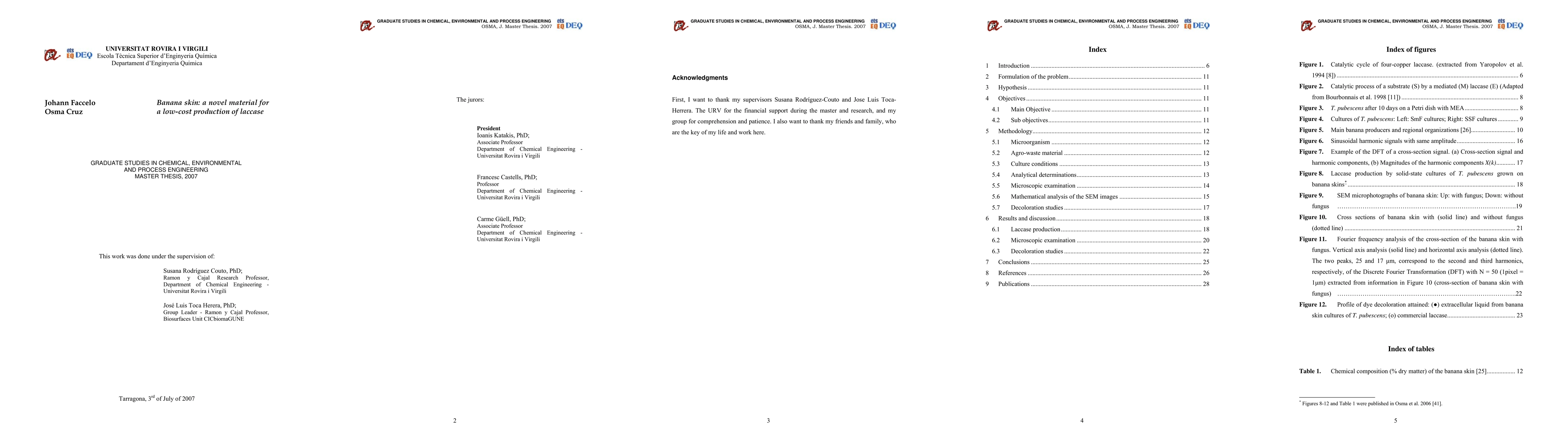 Laccases (benzenodiol: oxygen oxidoreductases; EC 1.10.3.2) are multicopper oxidases of wide substrate specificity mainly found in white-rot fungi, which are the only microorganisms able to degrade the whole wood components, but they are also expressed in bacteria and higher plants. Laccases are used currently in biotechnological processes because this enzyme oxidizes both phenolic and non-phenolic lignin-related compounds as well as highly recalcitrant environmental pollutants. In this work banana skin has been selected as a supporting material for laccase produntion because of its high content in carbohydrates, which due to their organic nature are easily metabolized by the fungus. In addition, its content in ascorbic acid exerts an inhibitory effect against bacteria. The activity of the produced laccase is tested in decoloration studies.