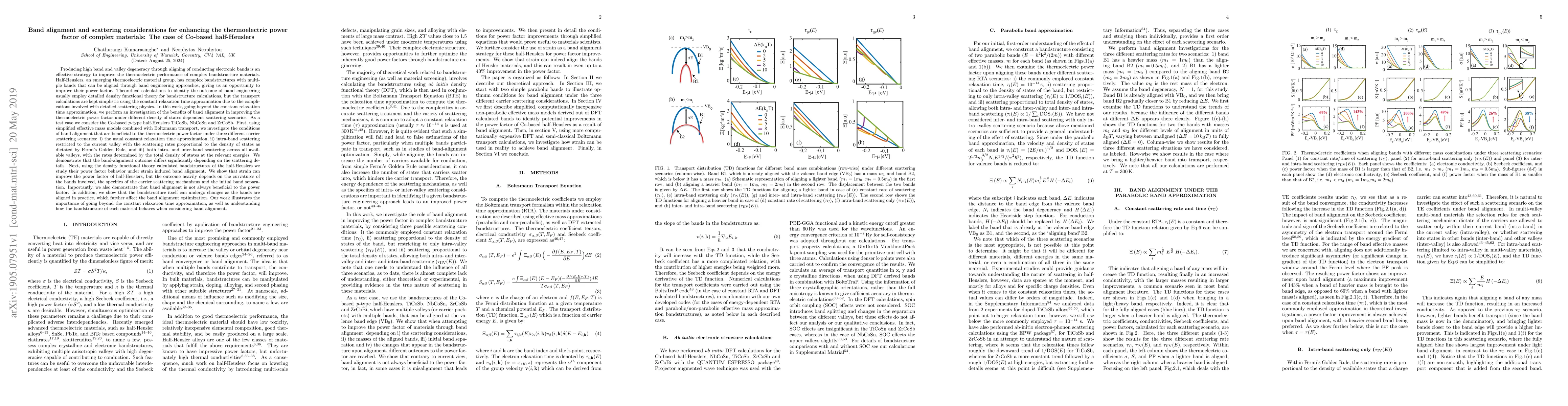 This paper investigates how band alignment and scattering mechanisms affect the thermoelectric power factor of Co-based half-Heuslers, demonstrating that strain-induced band alignment can improve the power factor, but its effectiveness depends on scattering details and band curvatures.