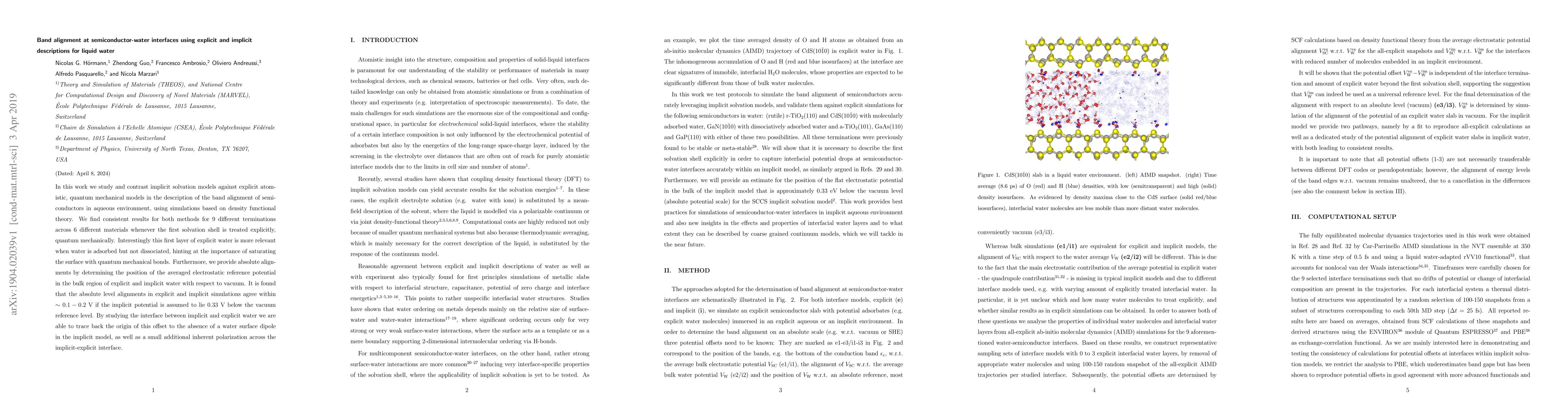 This research compares implicit and explicit models for describing semiconductor-water interfaces, finding that both methods yield consistent results when the first solvation shell is treated explicitly. The study highlights the importance of quantum mechanical treatment of the first water layer, especially when water is adsorbed but not dissociated.