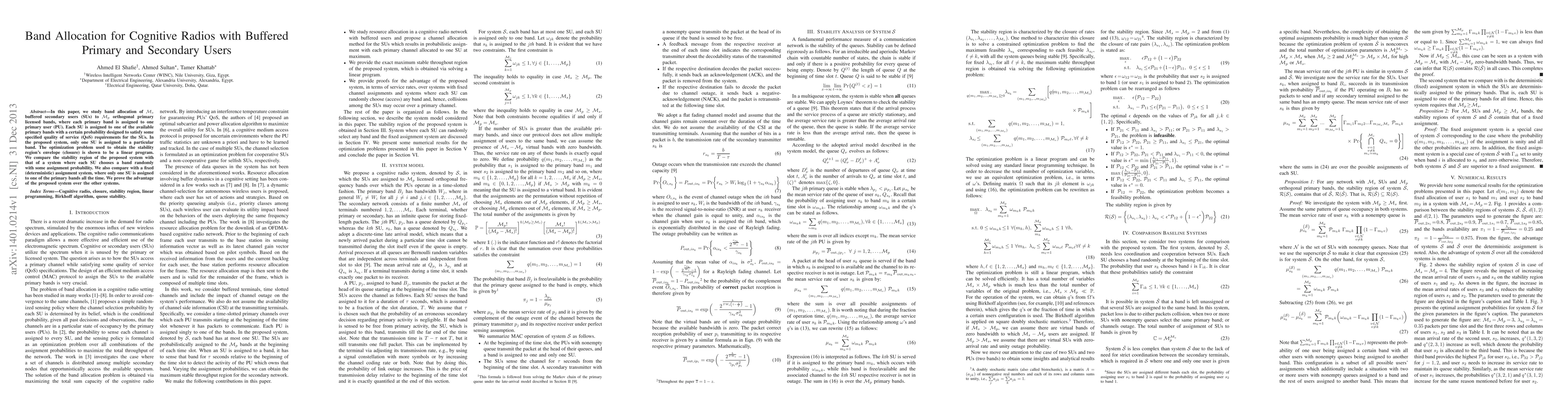 In this paper, we study band allocation of $\mathcal{M}_s$ buffered secondary users (SUs) to $\mathcal{M}_p$ orthogonal primary licensed bands, where each primary band is assigned to one primary user (PU). Each SU is assigned to one of the available primary bands with a certain probability designed to satisfy some specified quality of service (QoS) requirements for the SUs. In the proposed system, only one SU is assigned to a particular band. The optimization problem used to obtain the stability region's envelope (closure) is shown to be a linear program. We compare the stability region of the proposed system with that of a system where each SU chooses a band randomly with some assignment probability. We also compare with a fixed (deterministic) assignment system, where only one SU is assigned to one of the primary bands all the time. We prove the advantage of the proposed system over the other systems.