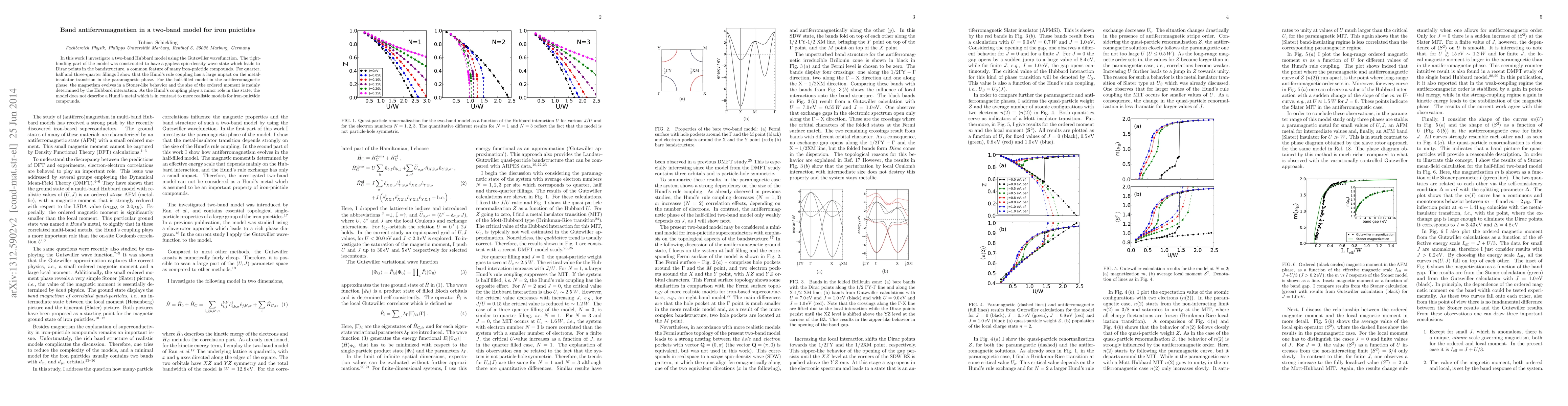 In this work I investigate a two-band Hubbard model using the Gutzwiller wavefunction. The tight-binding part of the model was constructed to have a gapless spin-density wave state which leads to Dirac points in the bandstructure, a common feature of many iron-pnictide compounds. For quarter, half and three-quarter fillings I show that the Hund's rule coupling has a large impact on the metal-insulator transition in the paramagnetic phase. For the half-filled model in the antiferromagnetic phase, the magnetism evolves in a Stoner-like behavior and the size of the ordered moment is mainly determined by the Hubbard interaction. As the Hund's coupling plays a minor role in this state, the model does not describe a Hund's metal which is in contrast to more realistic models for iron-pnictide compounds.
