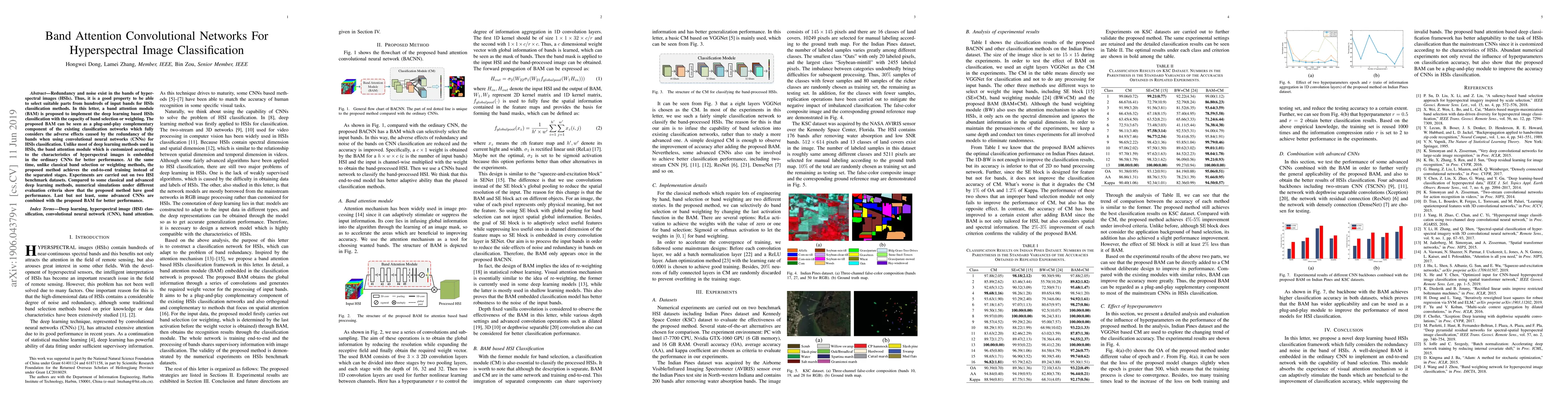This paper proposes a Band Attention Module (BAM) to enhance convolutional neural networks for hyperspectral image classification by selecting and weighting relevant bands, reducing redundancy and noise. The BAM achieves end-to-end training and outperforms classical and advanced deep learning methods on benchmark datasets.