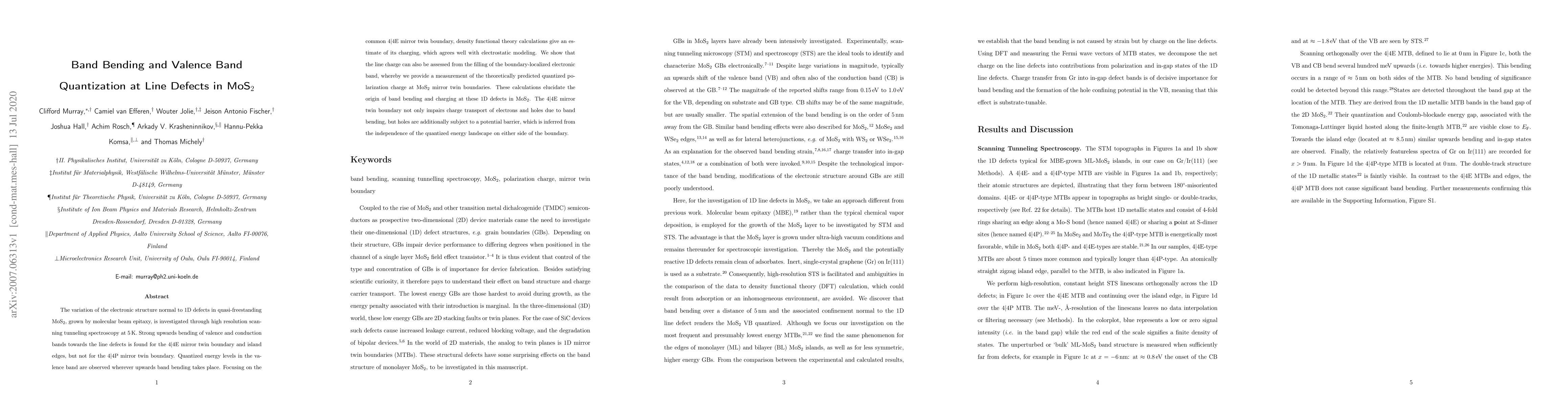 This paper investigates the electronic structure changes at line defects in MoS$_2$ using scanning tunneling spectroscopy, revealing strong upwards band bending and valence band quantization at 4|4E mirror twin boundaries. Density functional theory and electrostatic modeling confirm the charging of these boundaries and provide insights into their impact on charge transport.
