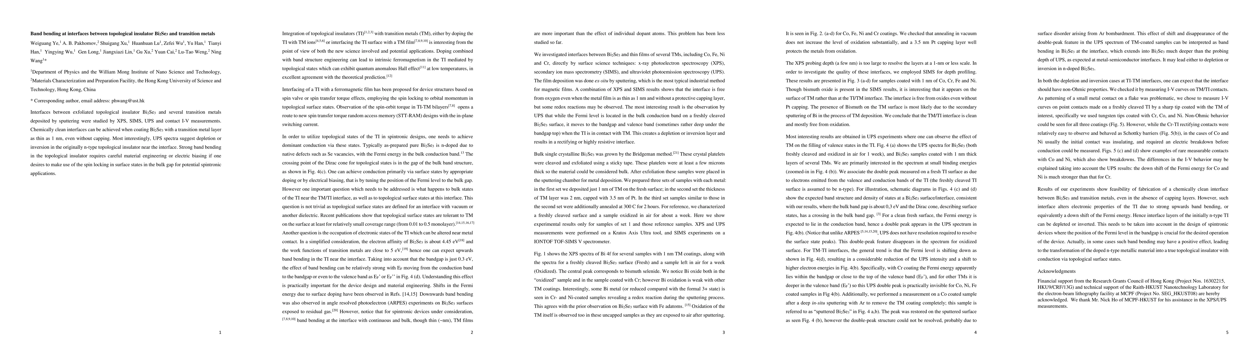 Summary: Interfaces between Bi2Se3 and transition metals show strong band bending near the contact, achieved with thin metal layers, suggesting necessary material engineering for leveraging spin-locked surface states in spintronic applications. XPS, SIMS, UPS, and contact I-V measurements reveal depletion or inversion in the n-type Bi2Se3 near the interface.