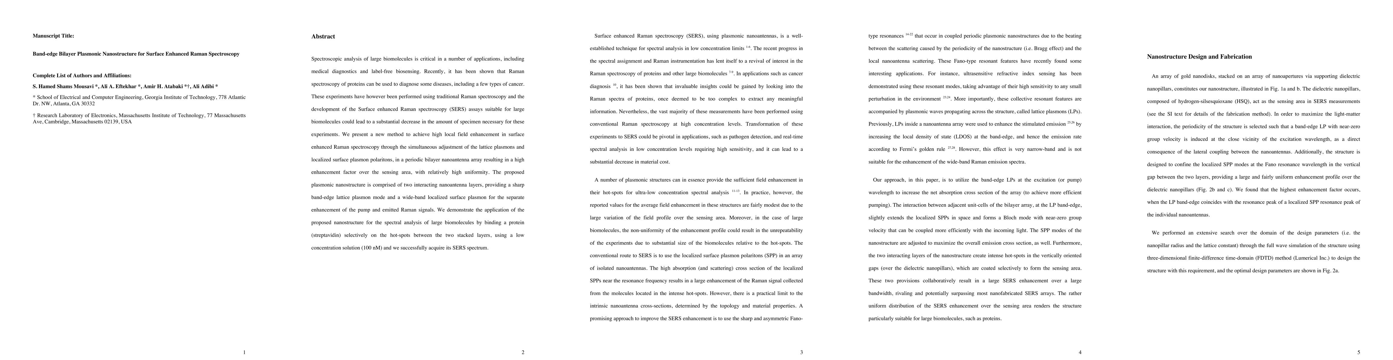 This paper proposes a novel bilayer plasmonic nanostructure to enhance surface-enhanced Raman spectroscopy (SERS) for analyzing large biomolecules, achieving high local field enhancement through lattice plasmons and localized surface plasmon polaritons. The method demonstrates successful SERS spectral analysis of a protein (streptavidin) at a low concentration, indicating potential for medical diagnostics.