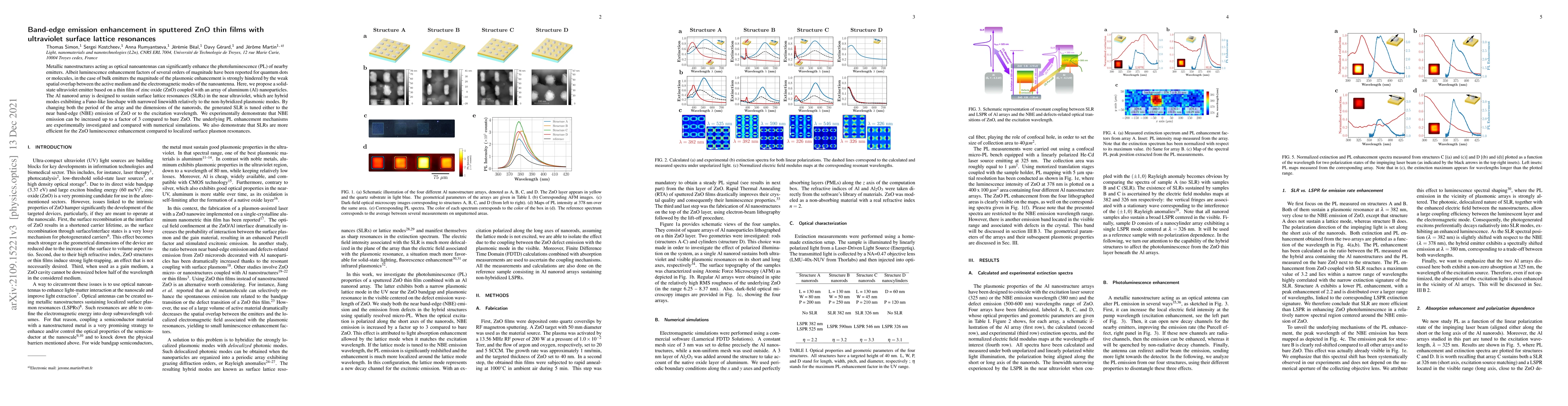 This paper investigates the enhancement of near band-edge emission in ZnO thin films using aluminum nanorod arrays to sustain surface lattice resonances. The study demonstrates a threefold increase in photoluminescence compared to bare ZnO, showing that surface lattice resonances are more effective than localized surface plasmon resonances for this enhancement.