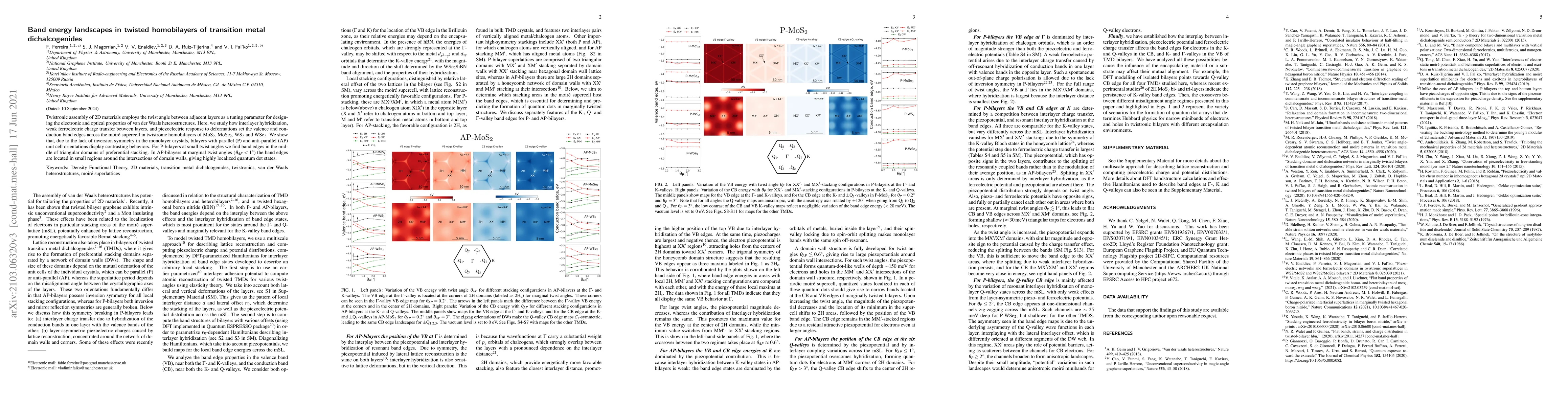 Twistronic assembly of 2D materials employs the twist angle between adjacent layers as a tuning parameter for designing the electronic and optical properties of van der Waals heterostructures. Here, we study how interlayer hybridization, weak ferroelectric charge transfer between layers, and piezoelectric response to deformations set the valence and conduction band edges across the moir{\'e} supercell in twistronic homobilayers of MoS$_2$, MoSe$_2$, WS$_2$ and WSe$_2$. We show that, due to the lack of inversion symmetry in the monolayer crystals, bilayers with parallel (P) and anti-parallel (AP) unit cell orientations display contrasting behaviors. For P-bilayers at small twist angles we find band edges in the middle of triangular domains of preferential stacking. In AP-bilayers at marginal twist angles ($\theta_{AP} < 1^\circ$) the band edges are located in small regions around the intersections of domain walls, giving highly localized quantum dot states.