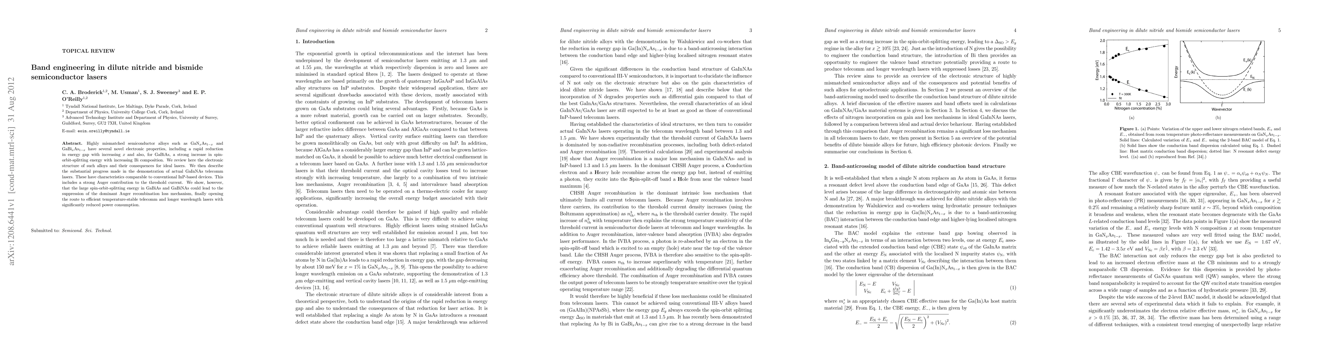 The paper discusses the unique electronic properties of dilute nitride and bismide semiconductor alloys, like GaNAs and GaBiAs, which exhibit a rapid energy gap reduction and strong spin-orbit splitting. It reviews their impact on laser performance and details advancements in GaInNAs telecomm lasers, comparable to InP-based devices. The key finding is that large spin-orbit splitting in GaBiAs and GaBiNAs could suppress Auger recombination, potentially leading to efficient, temperature-stable, and low-power consumption lasers for telecom and longer wavelength applications.