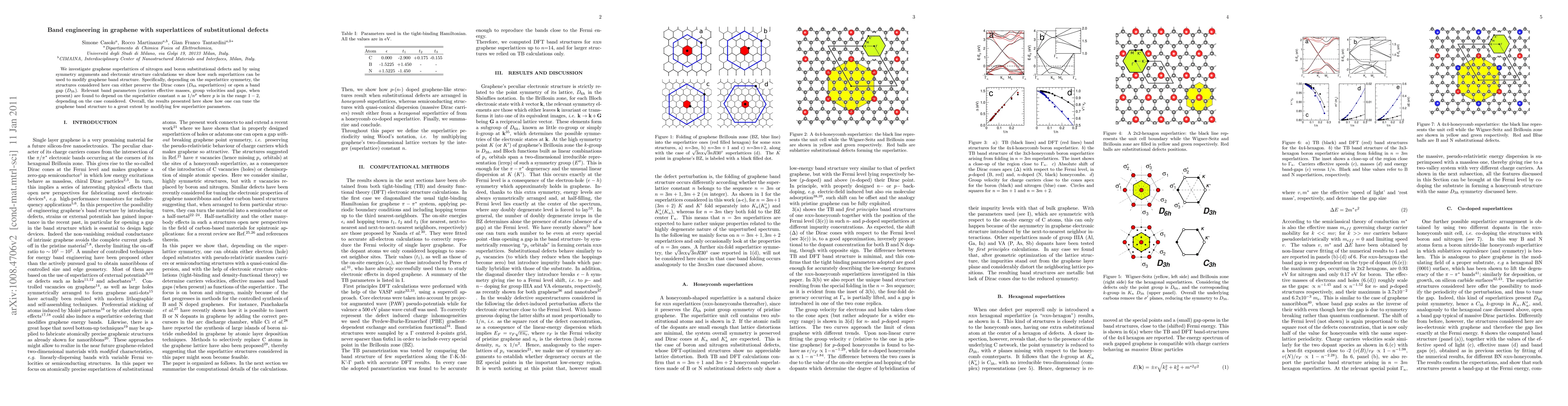This paper explores graphene superlattices engineered with nitrogen and boron substitutional defects. It demonstrates how these superlattices can modify graphene's band structure, either preserving Dirac cones or opening a band gap depending on the superlattice symmetry, and shows that key band parameters vary inversely with the superlattice constant.