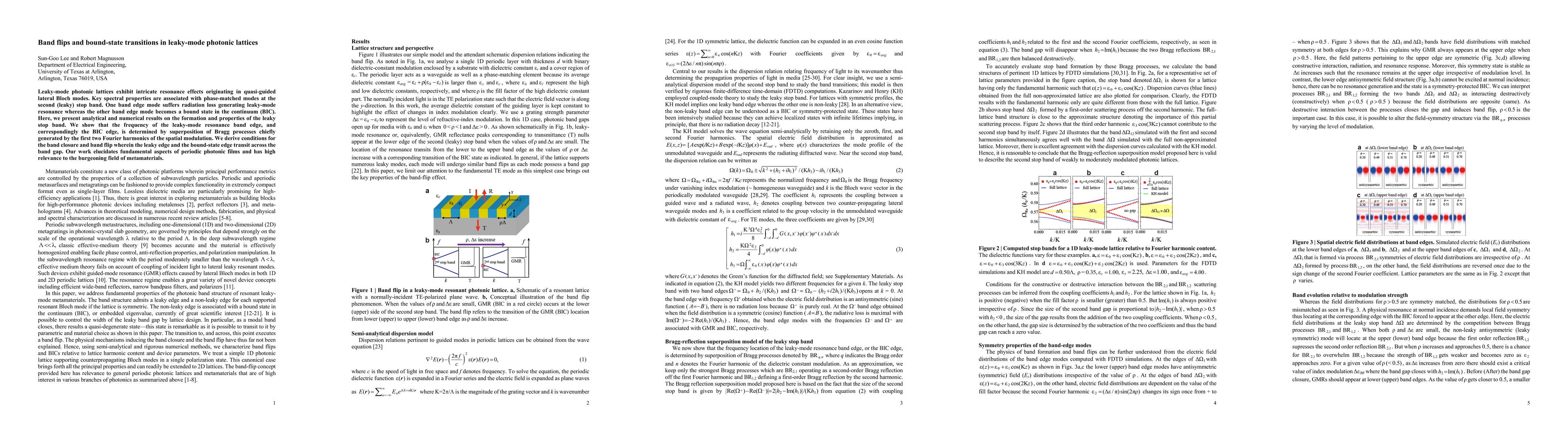 Leaky-mode photonic lattices exhibit intricate resonance effects originating in quasi-guided lateral Bloch modes. Key spectral properties are associated with phase-matched modes at the second (leaky) stop band. One band edge mode suffers radiation loss generating leaky-mode resonance whereas the other band edge mode becomes a bound state in the continuum (BIC). Here, we present analytical and numerical results on the formation and properties of the leaky stop band. We show that the frequency of the leaky-mode resonance band edge, and correspondingly the BIC edge, is determined by superposition of Bragg processes chiefly generated by the first two Fourier harmonics of the spatial modulation. We derive conditions for the band closure and band flip wherein the leaky edge and the bound-state edge transit across the band gap. Our work elucidates fundamental aspects of periodic photonic films and has high relevance to the burgeoning field of metamaterials.
