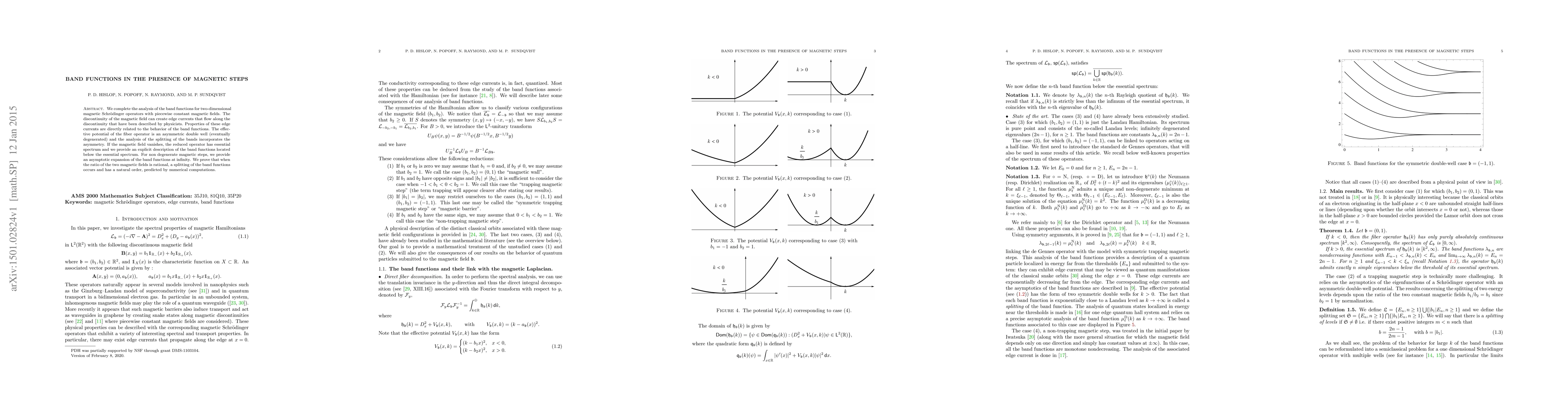 We complete the analysis of the band functions for two-dimensional magnetic Schr\"odinger operators with piecewise constant magnetic fields. The discontinuity of the magnetic field can create edge currents that ow along the discontinuity that have been described by physicists. Properties of these edge currents are directly related to the behavior of the band functions. The effective potential of the fiber operator is an asymmetric double well (eventually degenerated) and the analysis of the splitting of the bands incorporates the asymmetry. If the magnetic field vanishes, the reduced operator has essential spectrum and we provide an explicit description of the band functions located below the essential spectrum. For non degenerate magnetic steps, we provide an asymptotic expansion of the band functions at infinity. We prove that when the ratio of the two magnetic fields is rational, a splitting of the band functions occurs and has a natural order, predicted by numerical computations.