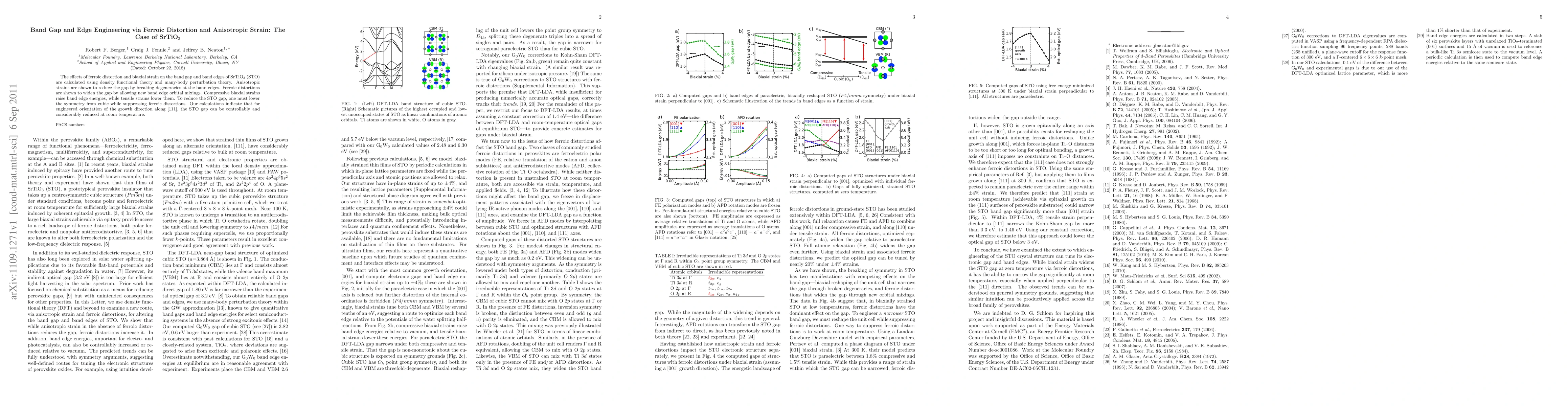 This research uses density functional theory and many-body perturbation theory to study how ferroic distortion and biaxial strain affect the band gap and edges of SrTiO3. It finds that anisotropic strains decrease the gap by lifting degeneracies, while ferroic distortions increase it through new orbital mixings. Compressive strains elevate band edge energies, and tensile strains lower them. To minimize the STO gap, lower the cubic symmetry while inhibiting ferroic distortions. The calculations suggest that for a [111] growth orientation, the STO gap can be significantly reduced at room temperature.