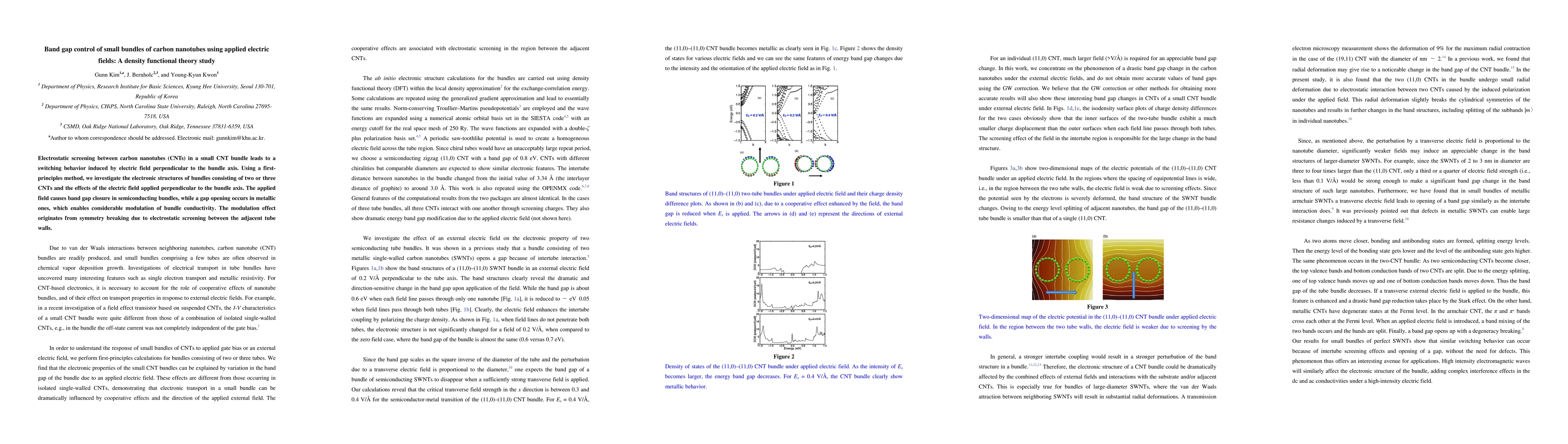 Summary: This study uses density functional theory to investigate how applied electric fields perpendicular to small carbon nanotube bundles modulate their band gaps, leading to conductivity changes through symmetry breaking and electrostatic screening effects. The field causes band gap closure in semiconducting bundles and gap opening in metallic ones.